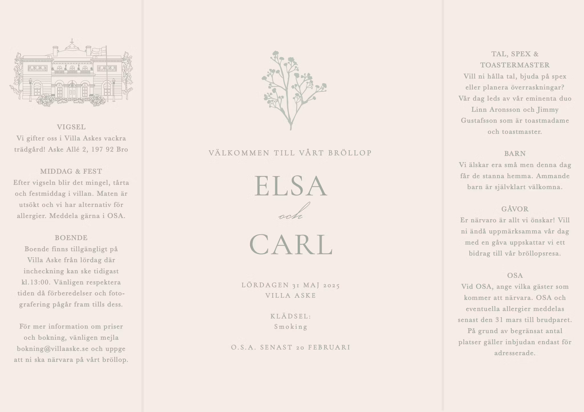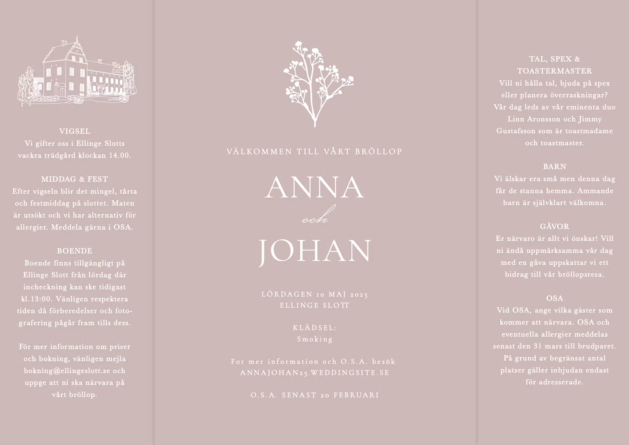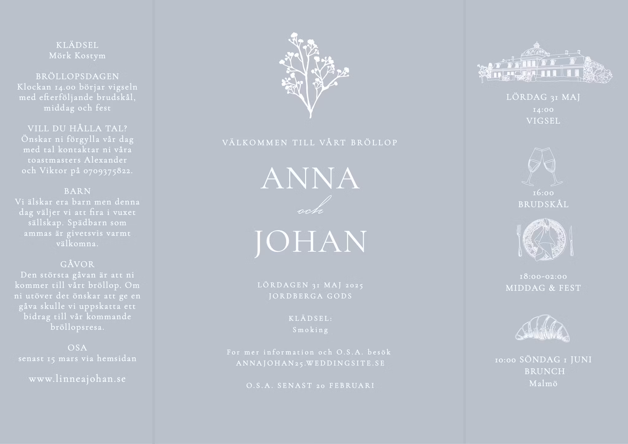 Med denna klassiska kollektion är till er som vill ha en stilren men ändå romantisk känsla. I denna inbjudan, som viks upp, går även att kombinera med en personlig tidslinje där personliga illustrationer skapas över er kyrka, festlokal och andra motiv vilket gör er inbjudan helt unik.