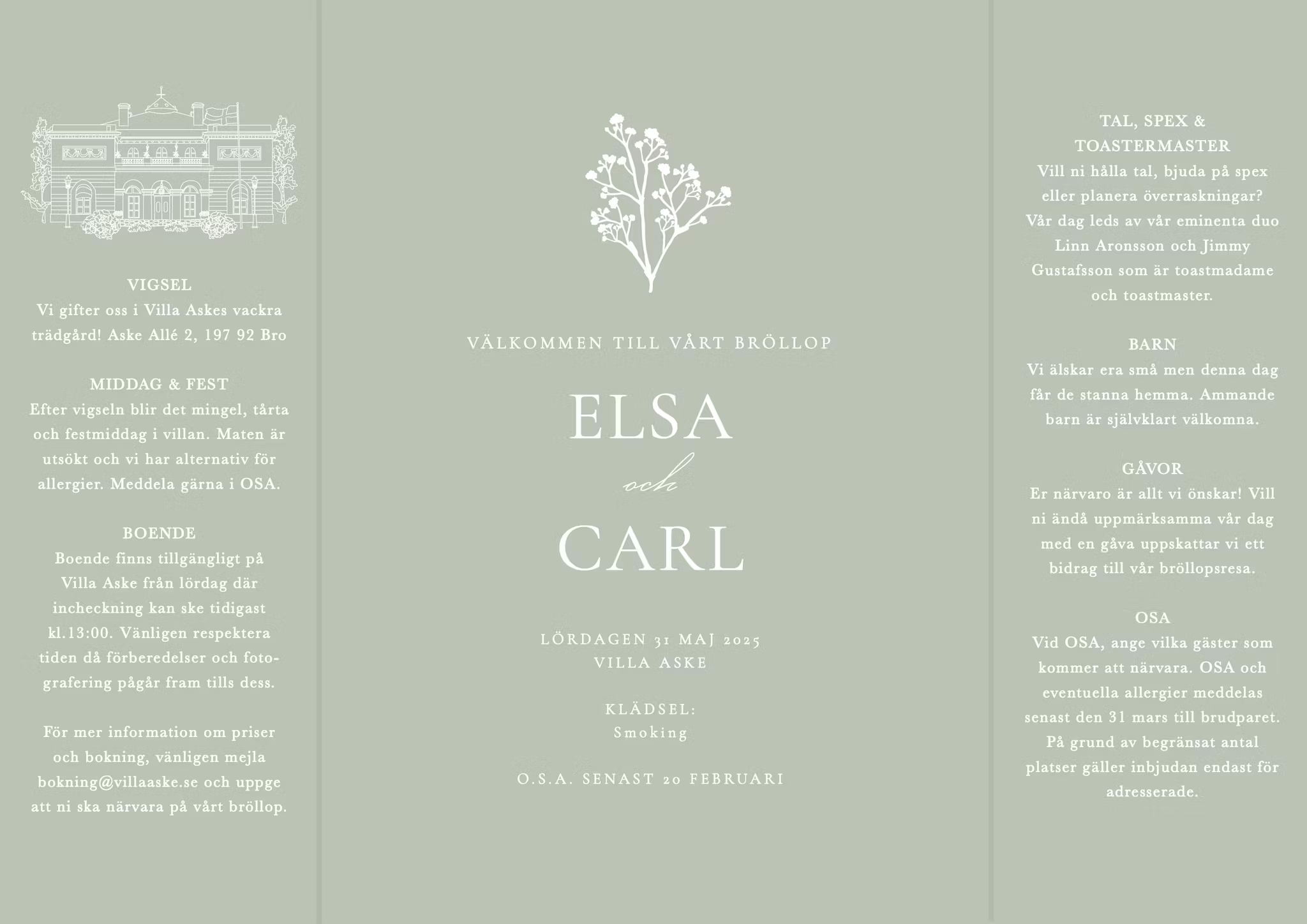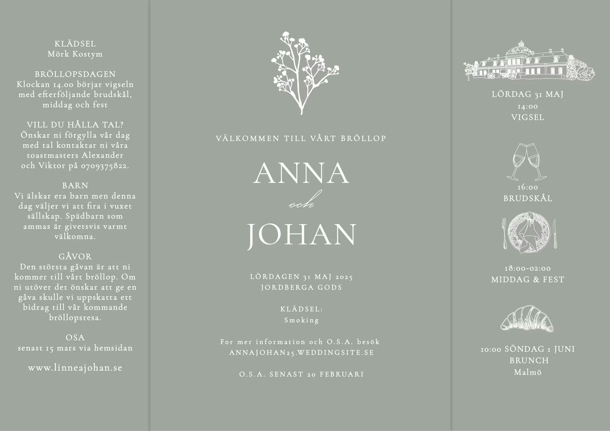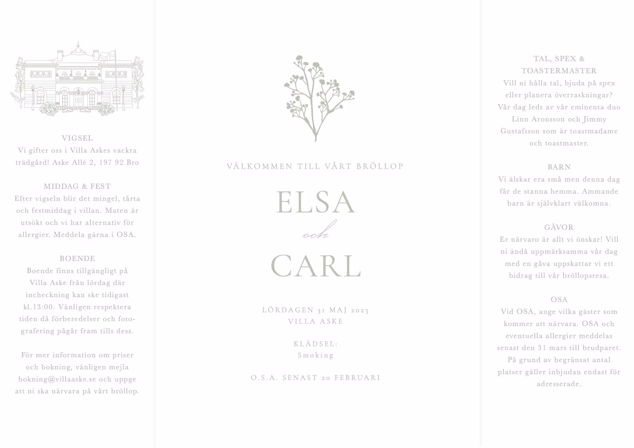Med denna klassiska kollektion är till er som vill ha en stilren men ändå romantisk känsla. I denna inbjudan, som viks upp, går även att kombinera med en personlig tidslinje där personliga illustrationer skapas över er kyrka, festlokal och andra motiv vilket gör er inbjudan helt unik.