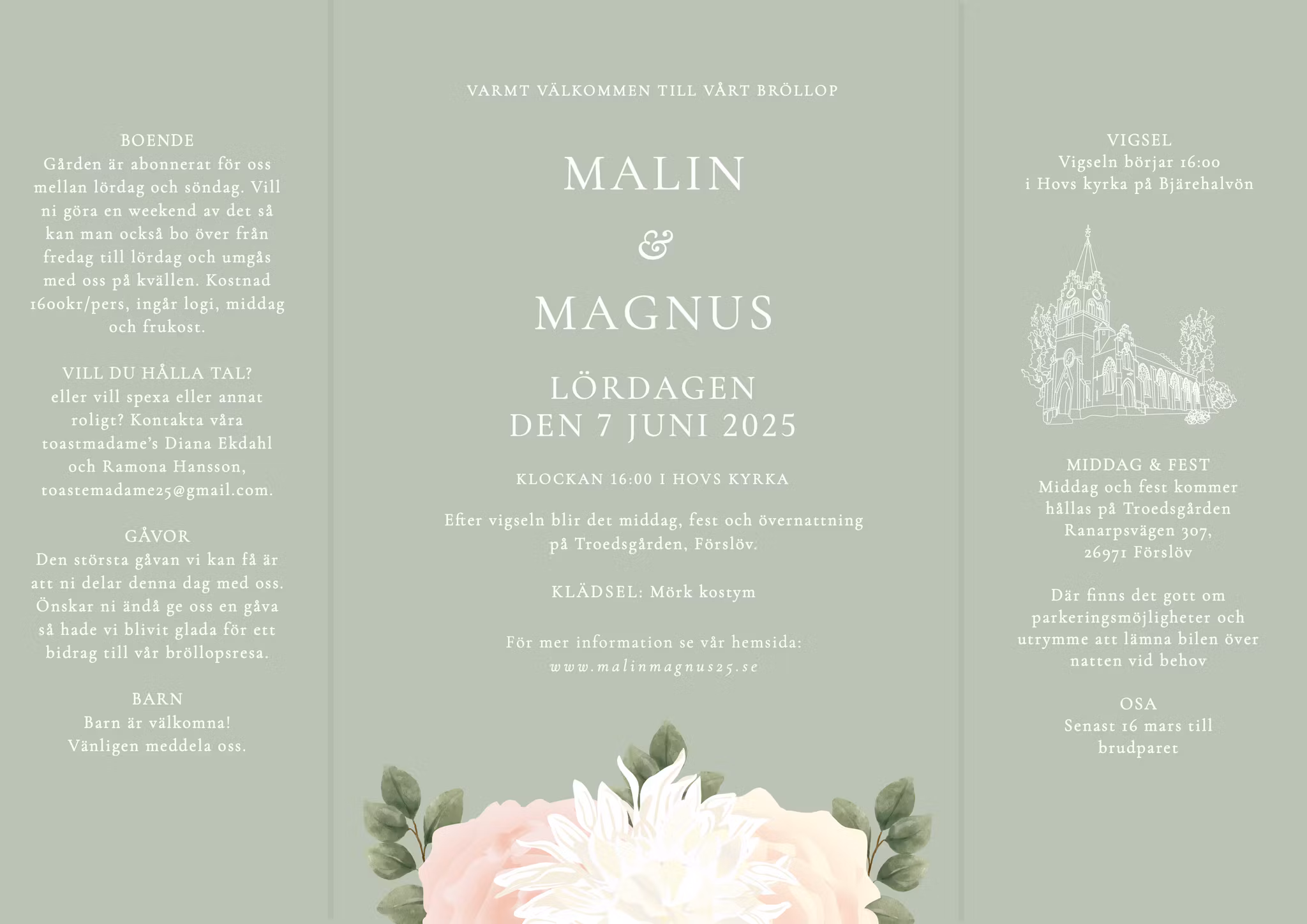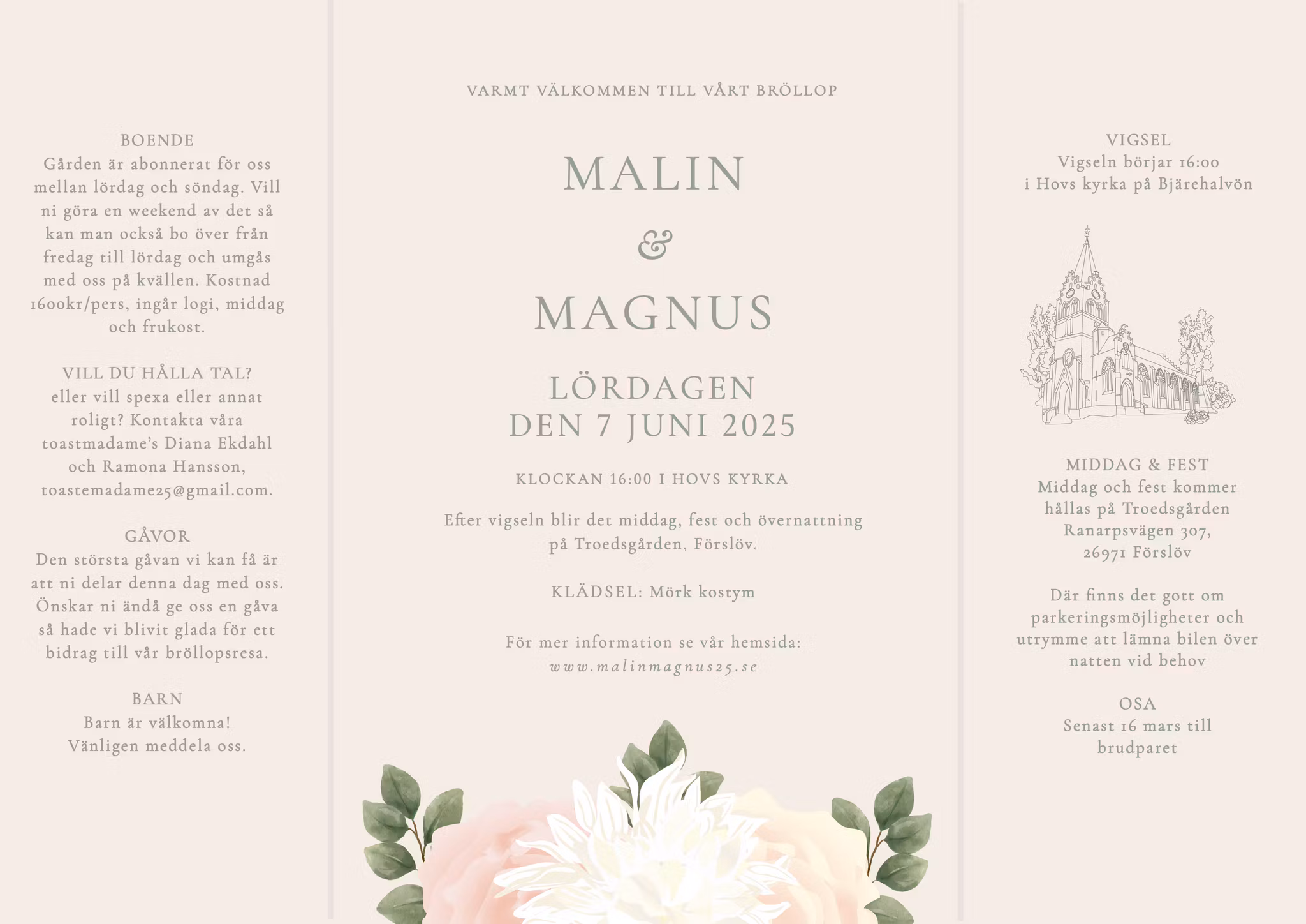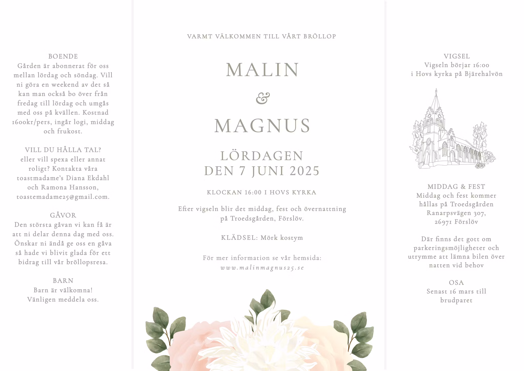 I denna inbjudan, som viks upp, möts gästen av romantiska rosor och eucalyptus.