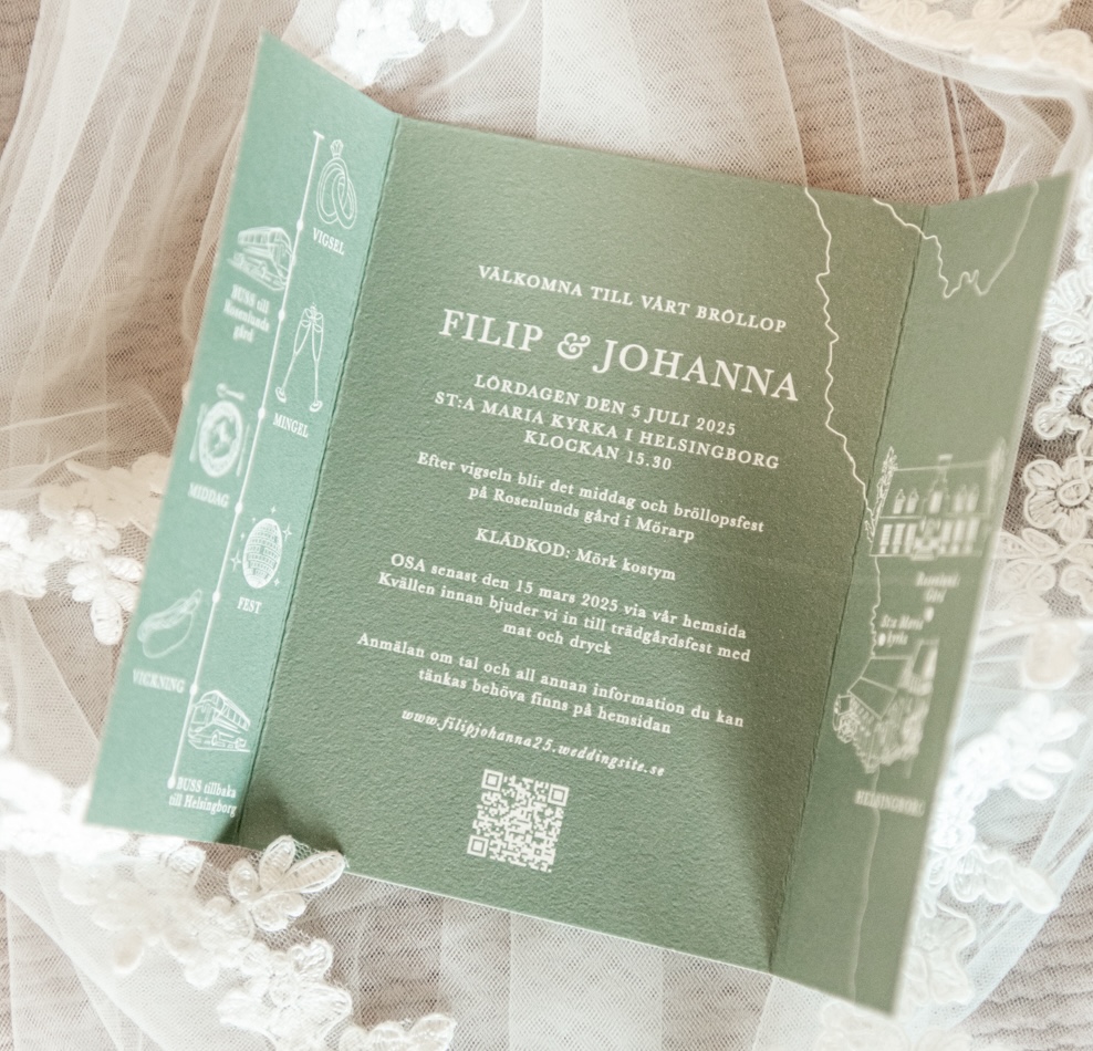 I denna inbjudan, som viks upp i gatefold-format, möts gästen av en dekorativ karta över bröllopsdagen som gör inbjudan helt unik och ett fint minne att spara. Märk ut er kyrka, hotell, festlokal eller andra ställen ni vill märka ut för era gäster. Det är även möjligt att kombinera med en illustrerad tidslinje över bröllopsdagen.