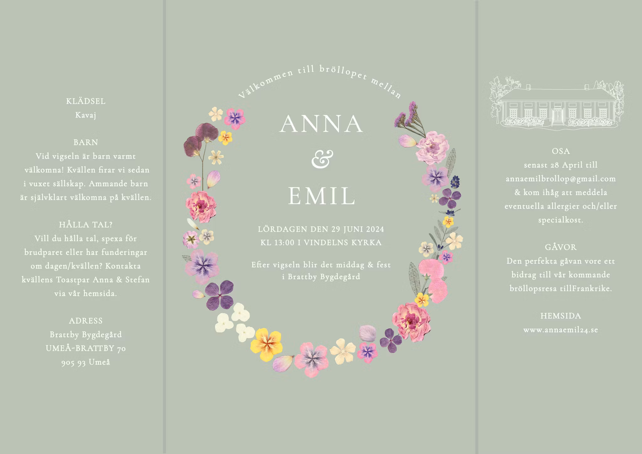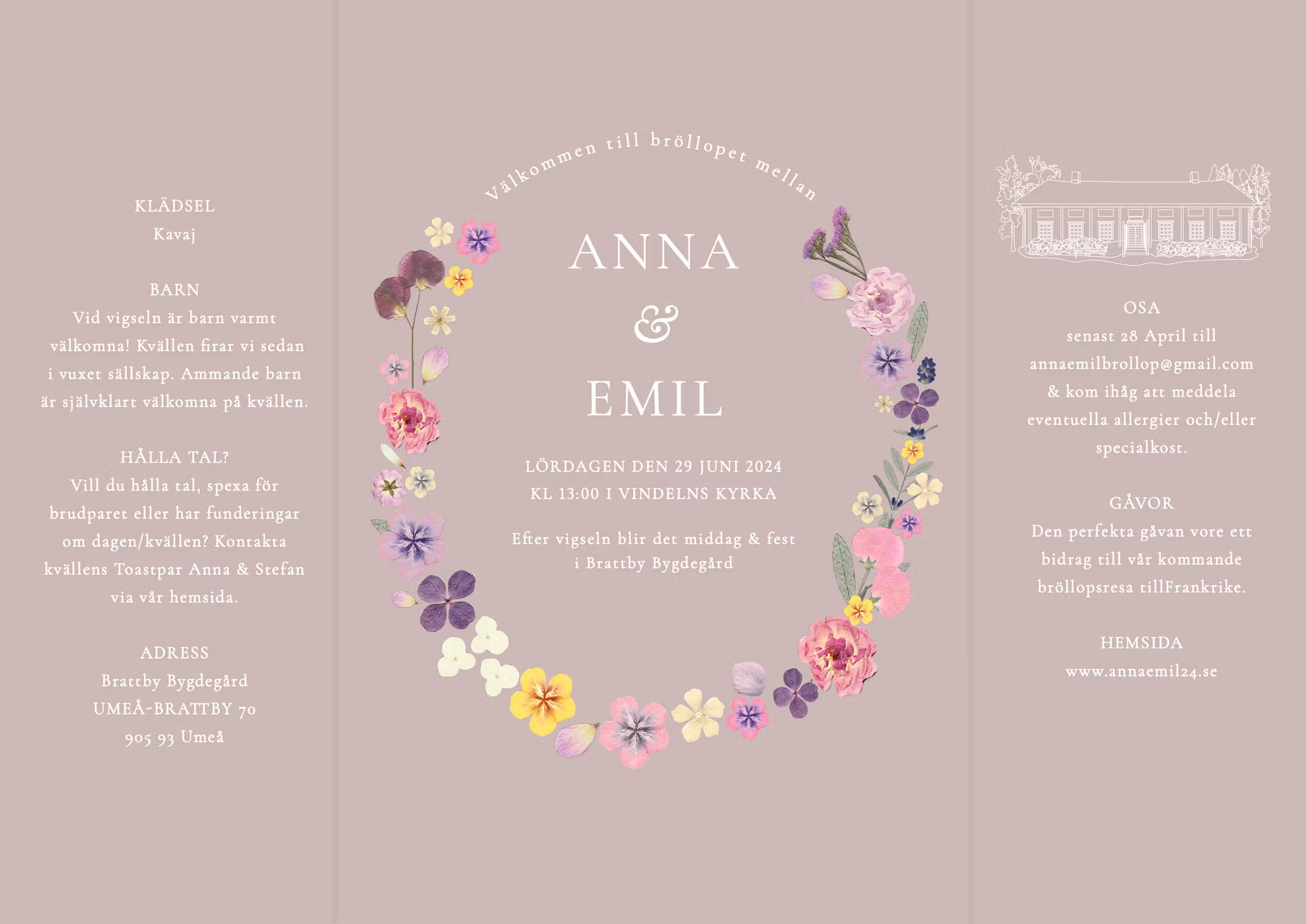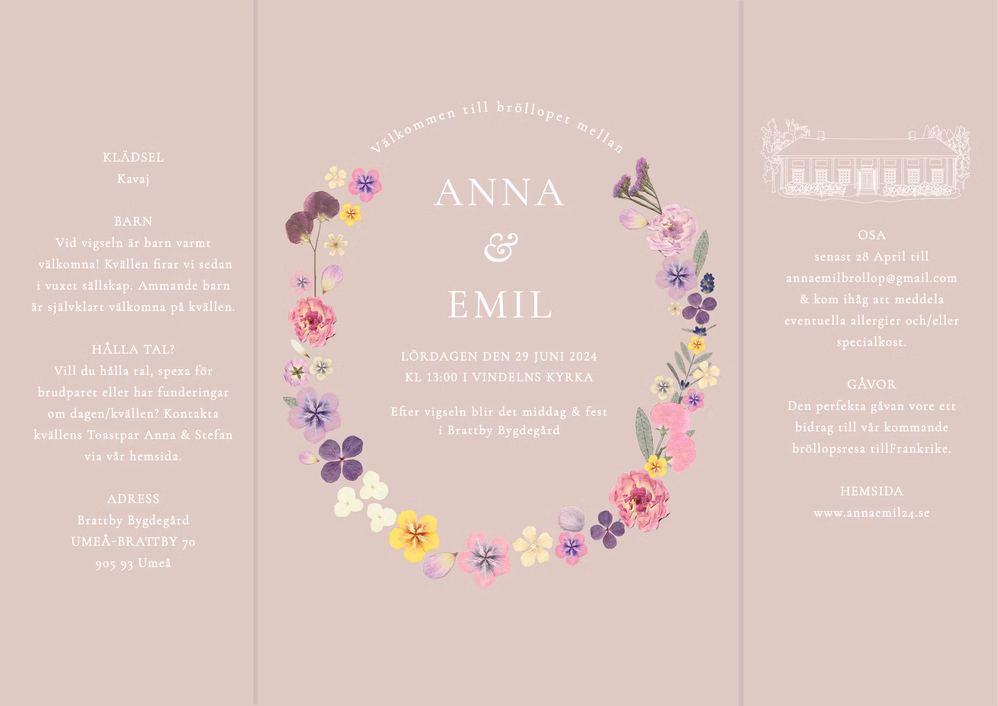 I denna färgsprakande blommande inbjudan, som är en mer färggrann version av Bröllopsinbjudan Bloom, inringas era namn av en krans av handplockade och pressade blommor från en sensommarträdgård. På sidorna får man plats med mycket text och kan även inkludera personliga illustrationer av exempelvis kyrka eller festlokal. Ni kan även få en personlig tidslinje över er stora dag som är både informativ och dekorativ för gästen.