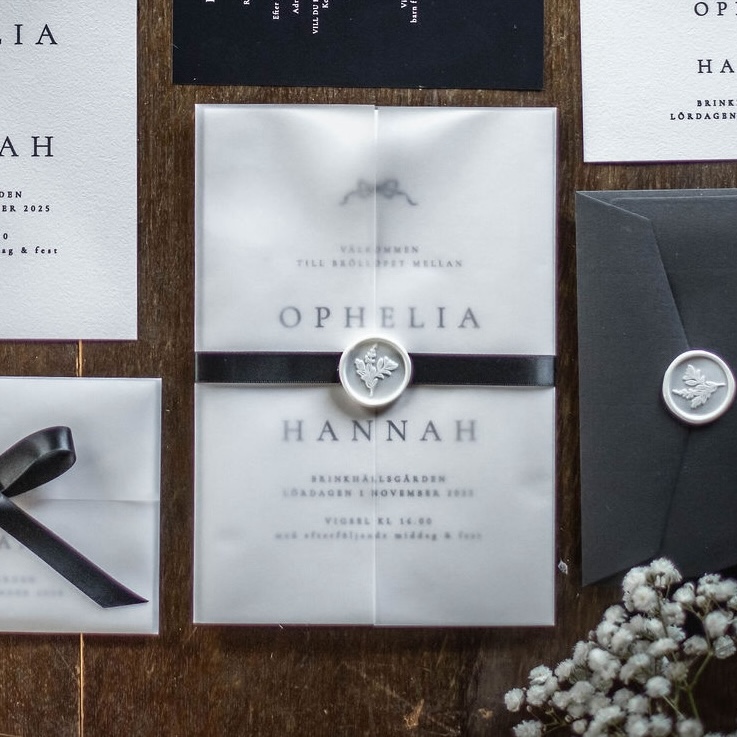 Vita kuvert ingår till varje inbjudan. Om du vill beställa en annan färg på kuverten, ett knytet band runt eller initialer på framsidan går det bra att beställa till som tillval.