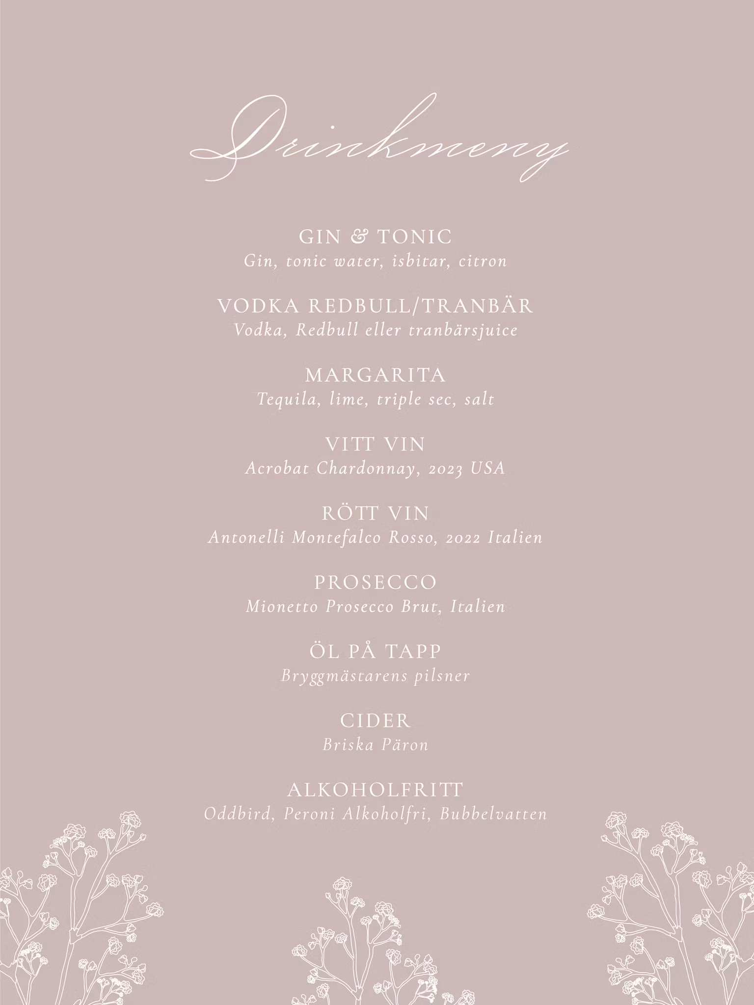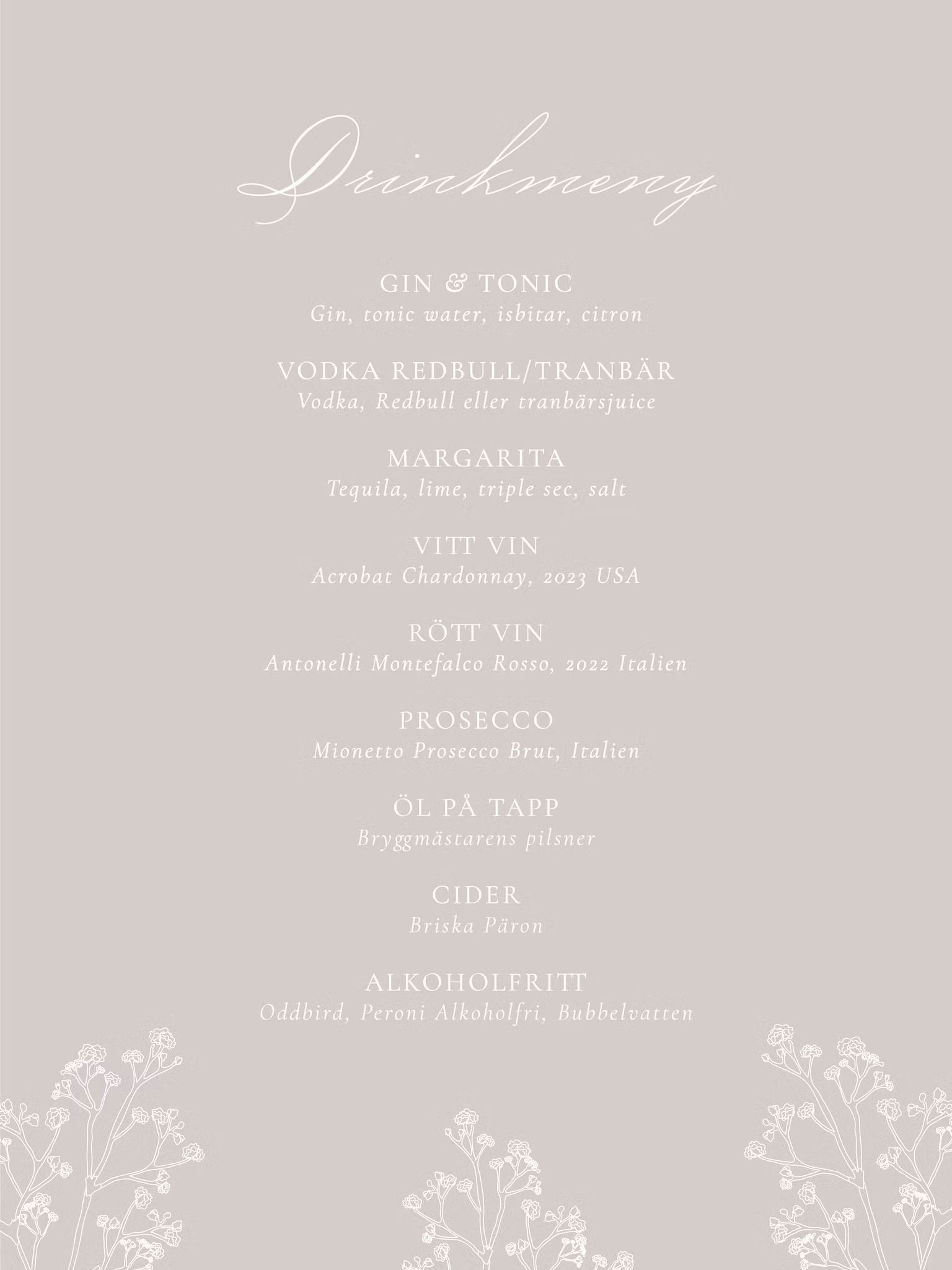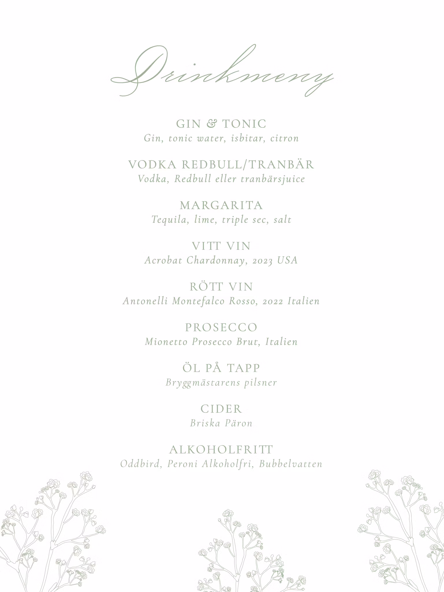 Låt illustrationer på era signaturdrinkar för kvällen pryda på denna drinkskylt! Det blir både dekorativt och informativt för gästerna när dom ska bestämma vilken drink dom är sugna på för kvällen. Skylten går att beställa i storlekarna 21x30 cm (A4), 30x40 cm eller 30x42 cm (A3) och trycks på matt premiumpapper.