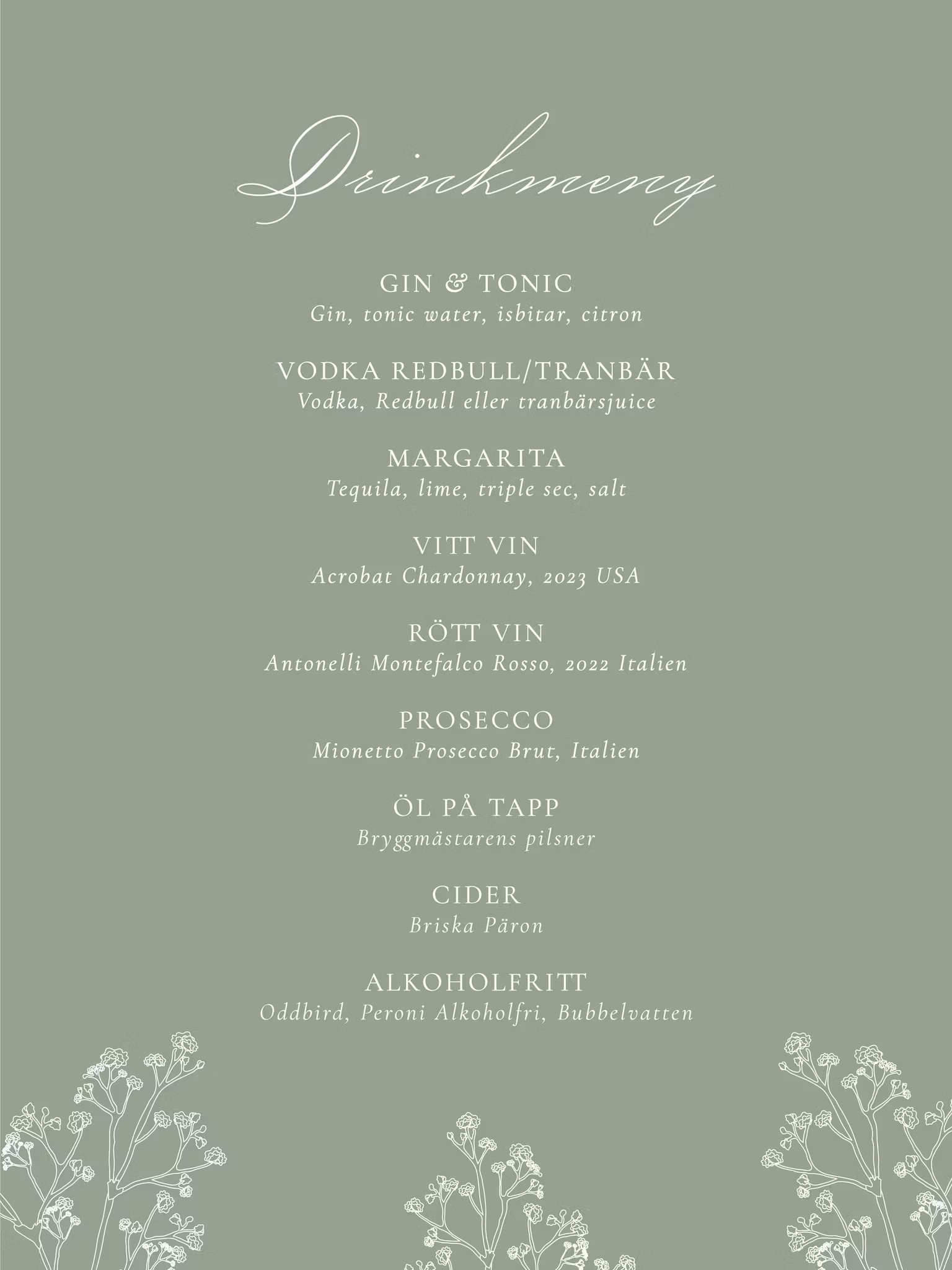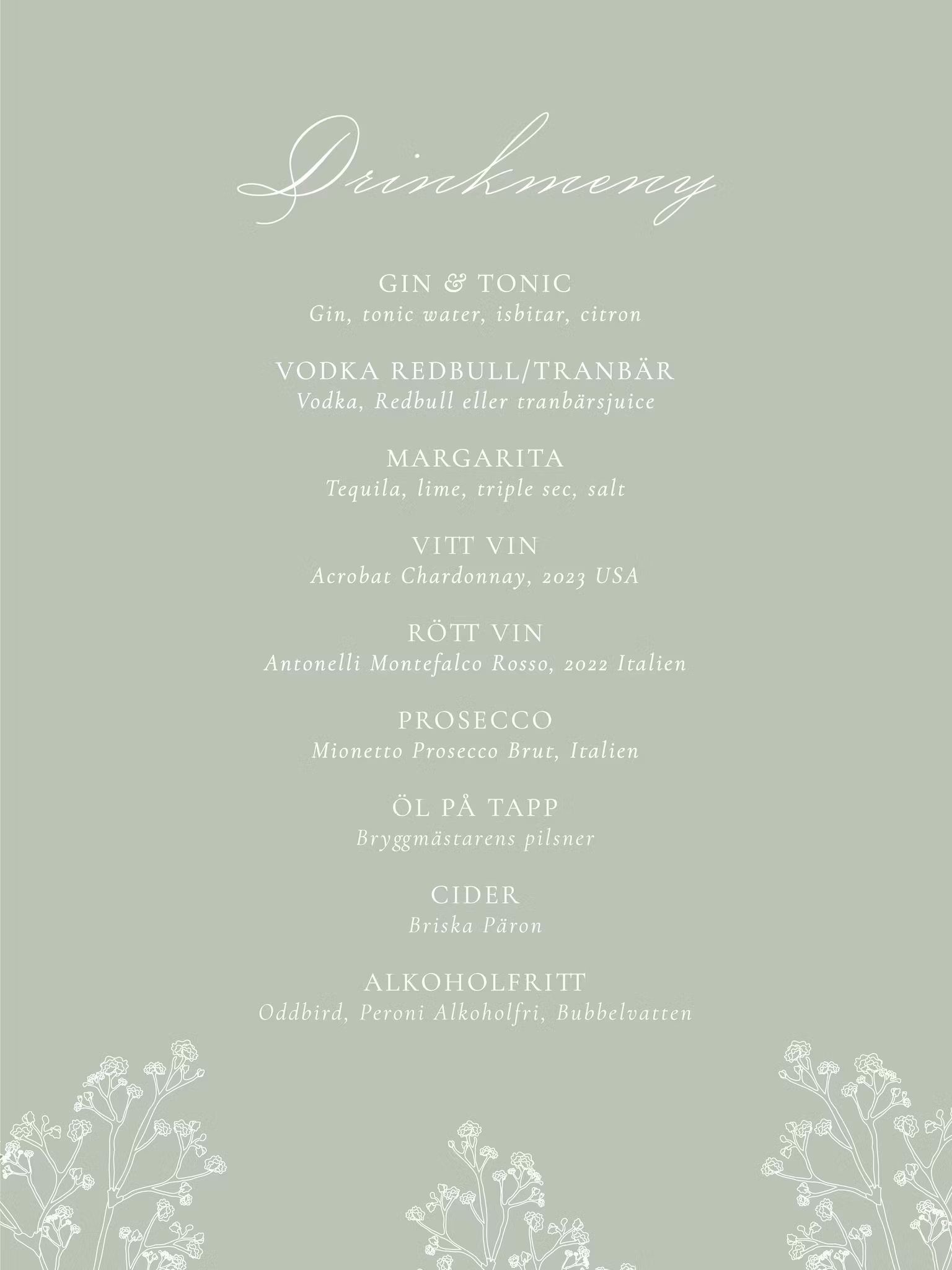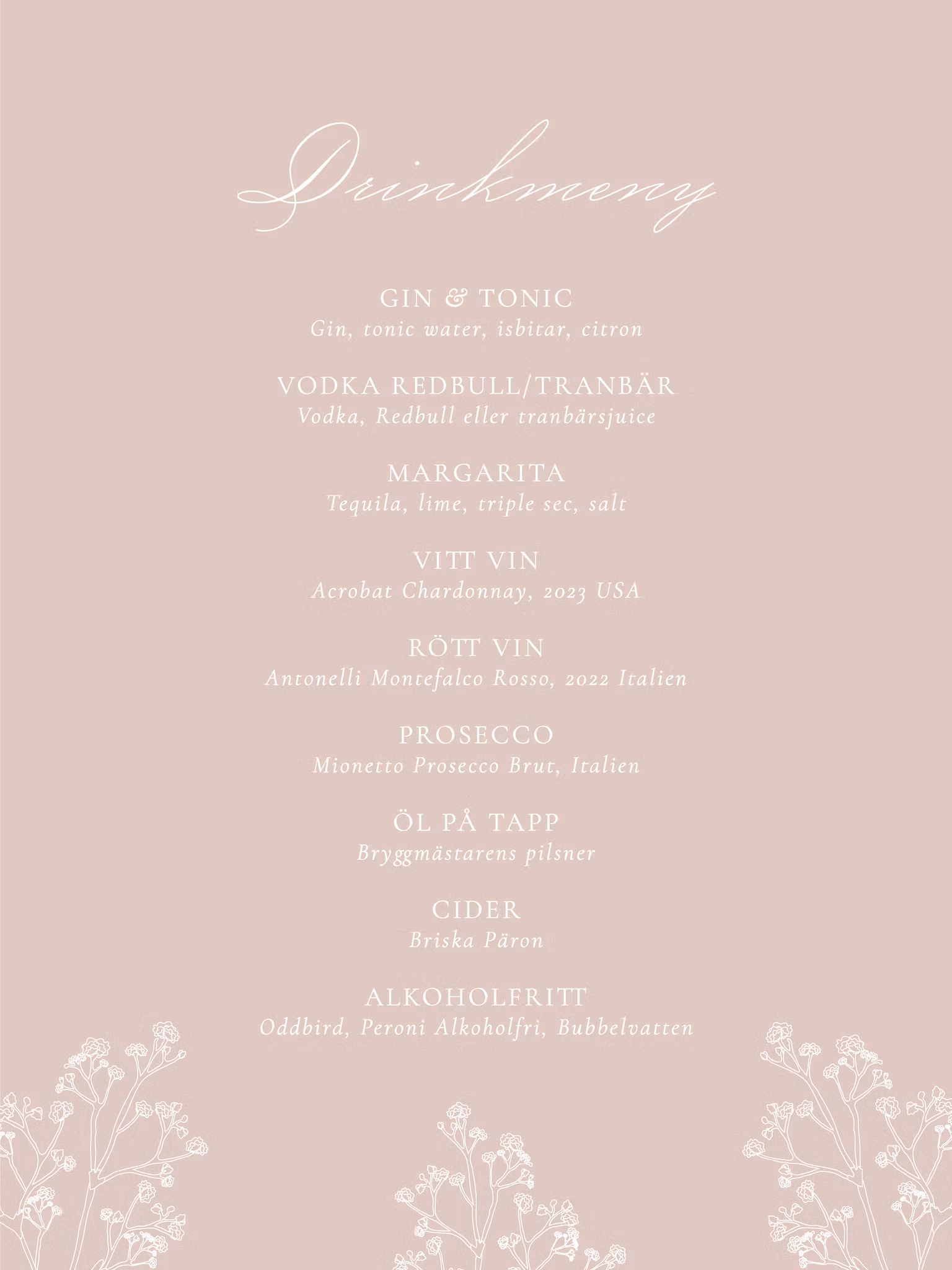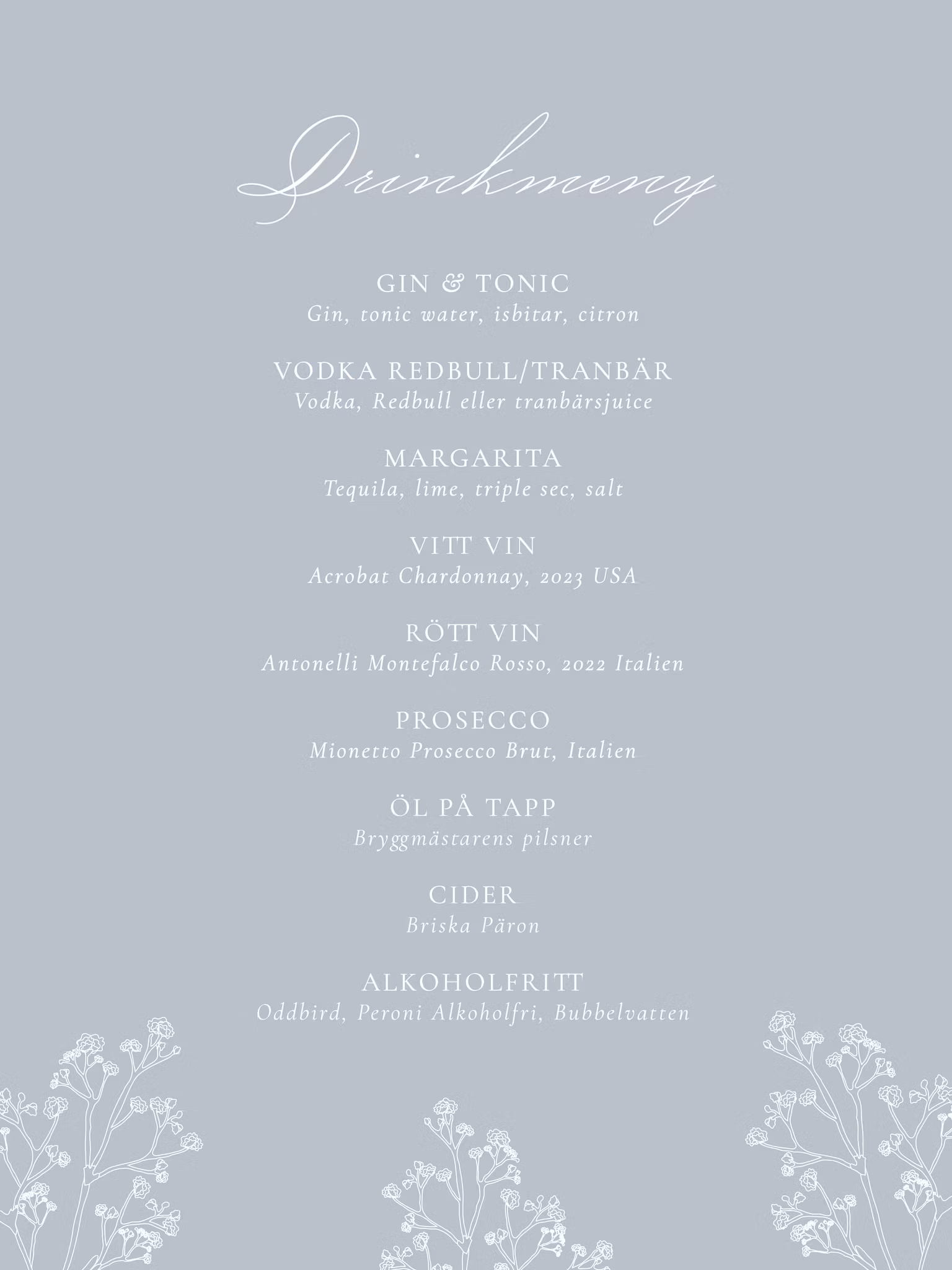 Låt illustrationer på era signaturdrinkar för kvällen pryda på denna drinkskylt! Det blir både dekorativt och informativt för gästerna när dom ska bestämma vilken drink dom är sugna på för kvällen. Skylten går att beställa i storlekarna 21x30 cm (A4), 30x40 cm eller 30x42 cm (A3) och trycks på matt premiumpapper.