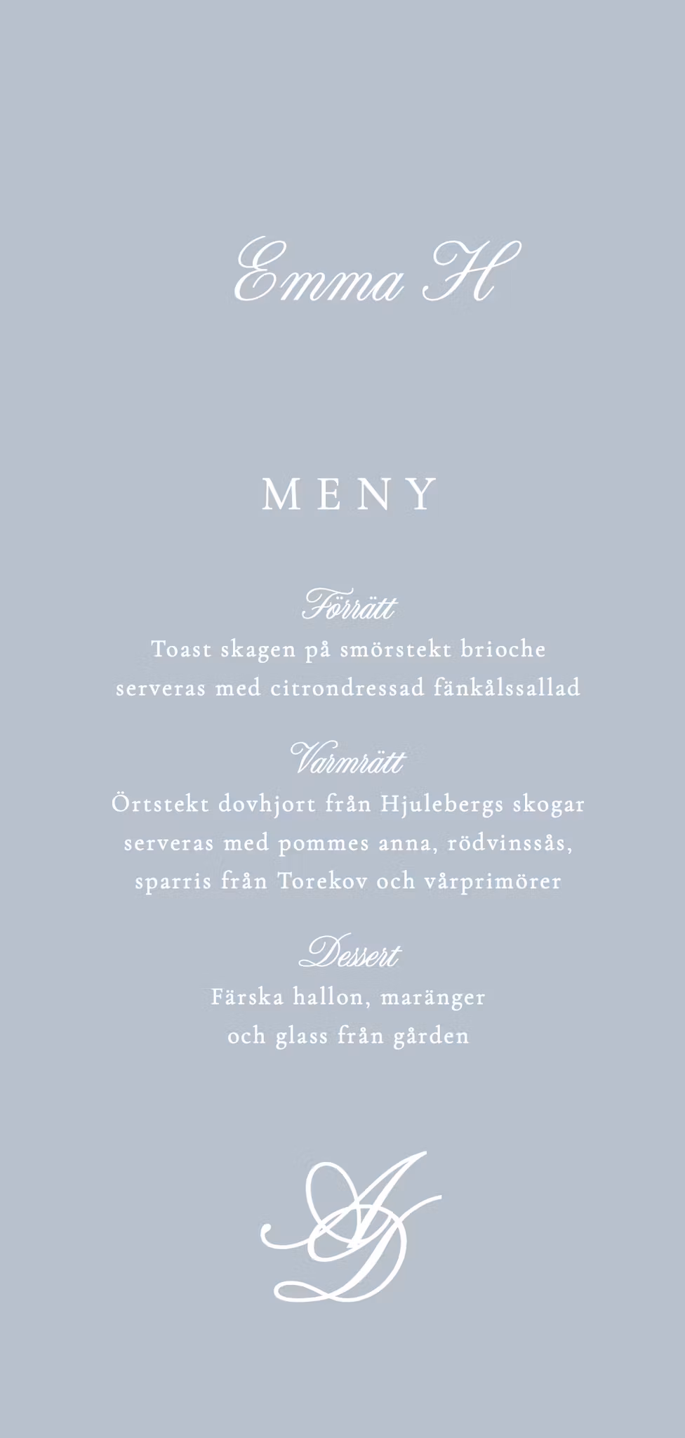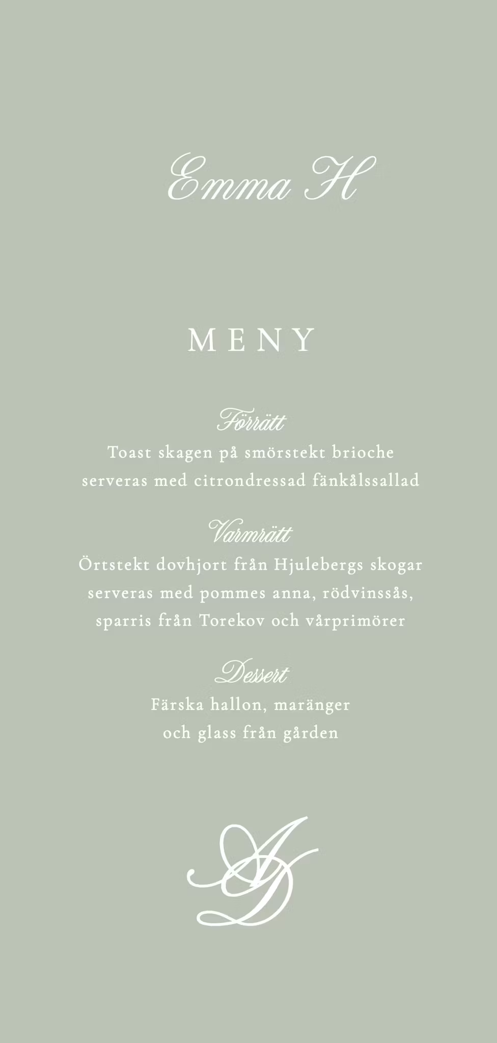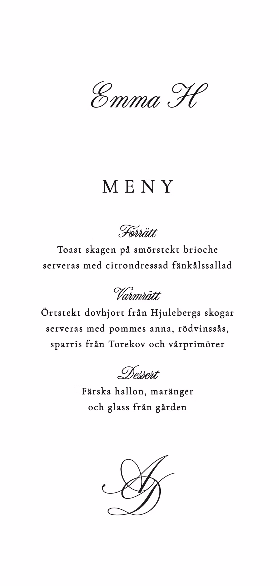 Dekorera dukningen med vackra menykort. På denna meny så trycks även gästens namn högst upp på menyn. Menyerna trycks på matt premiumpapper i storlek 10x21 cm.