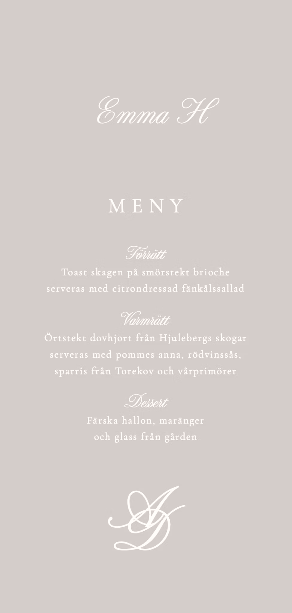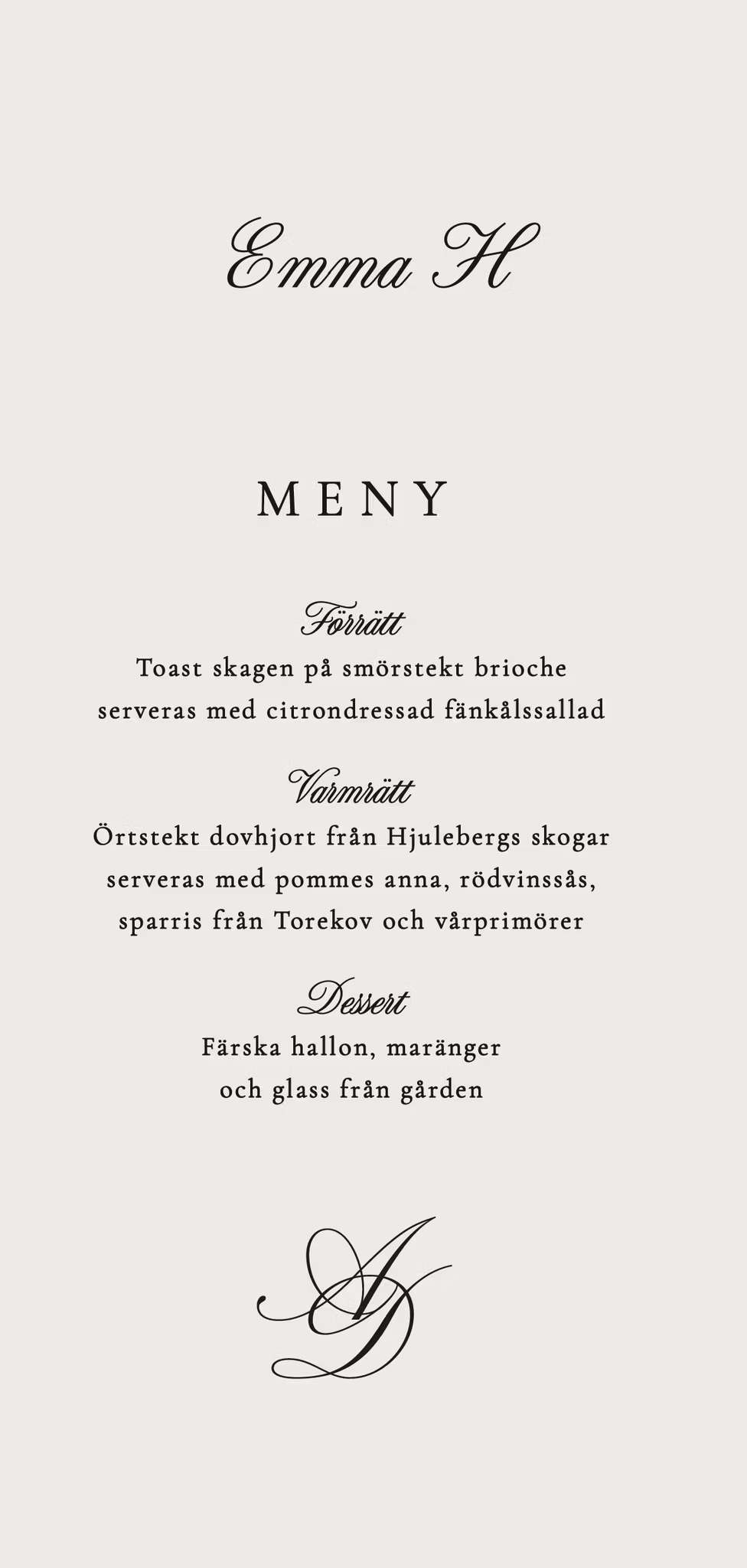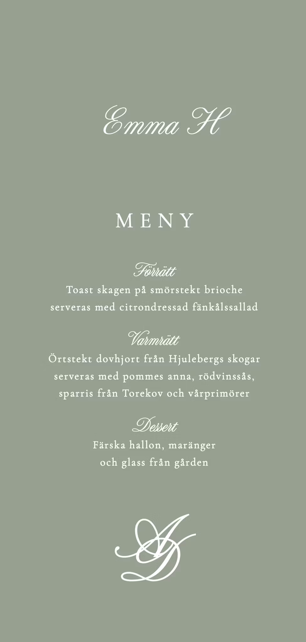 Dekorera dukningen med vackra menykort. På denna meny så trycks även gästens namn högst upp på menyn. Menyerna trycks på matt premiumpapper i storlek 10x21 cm.