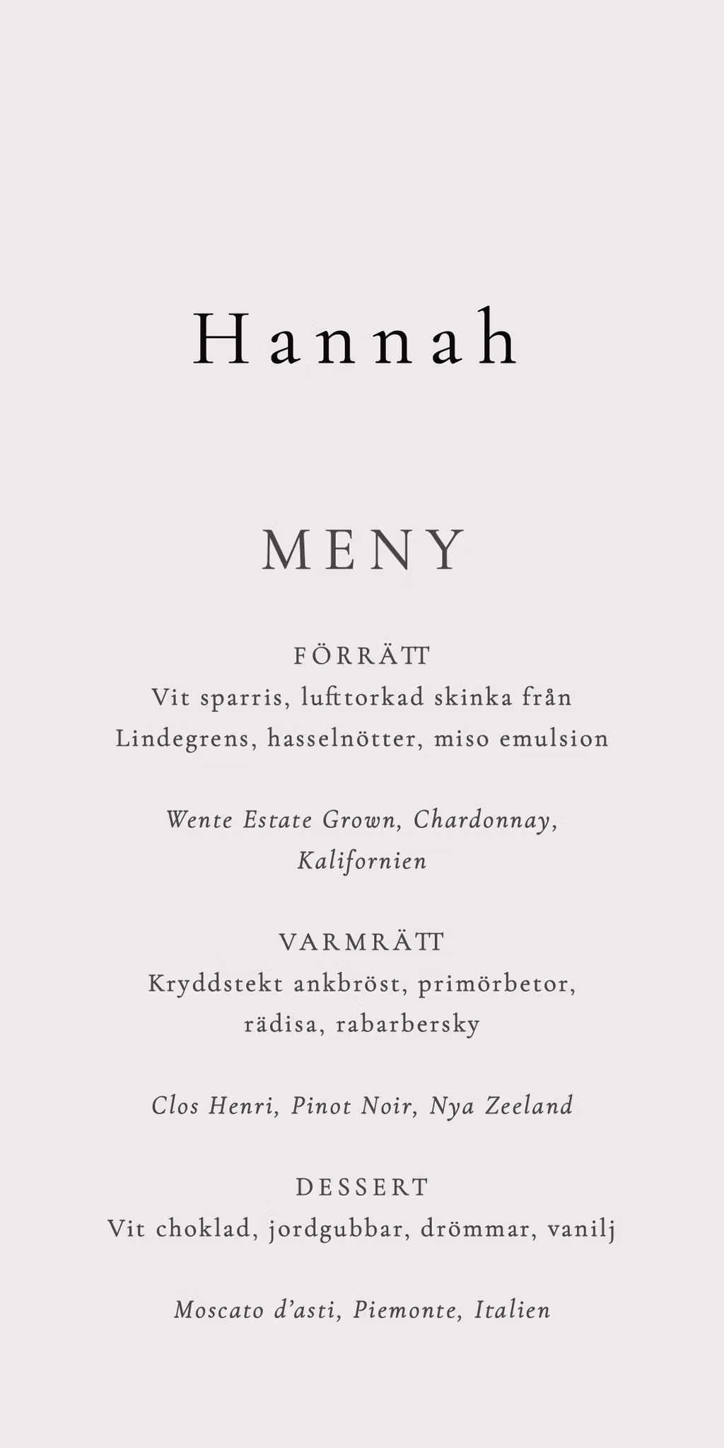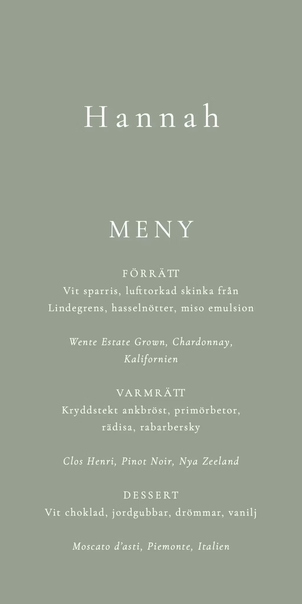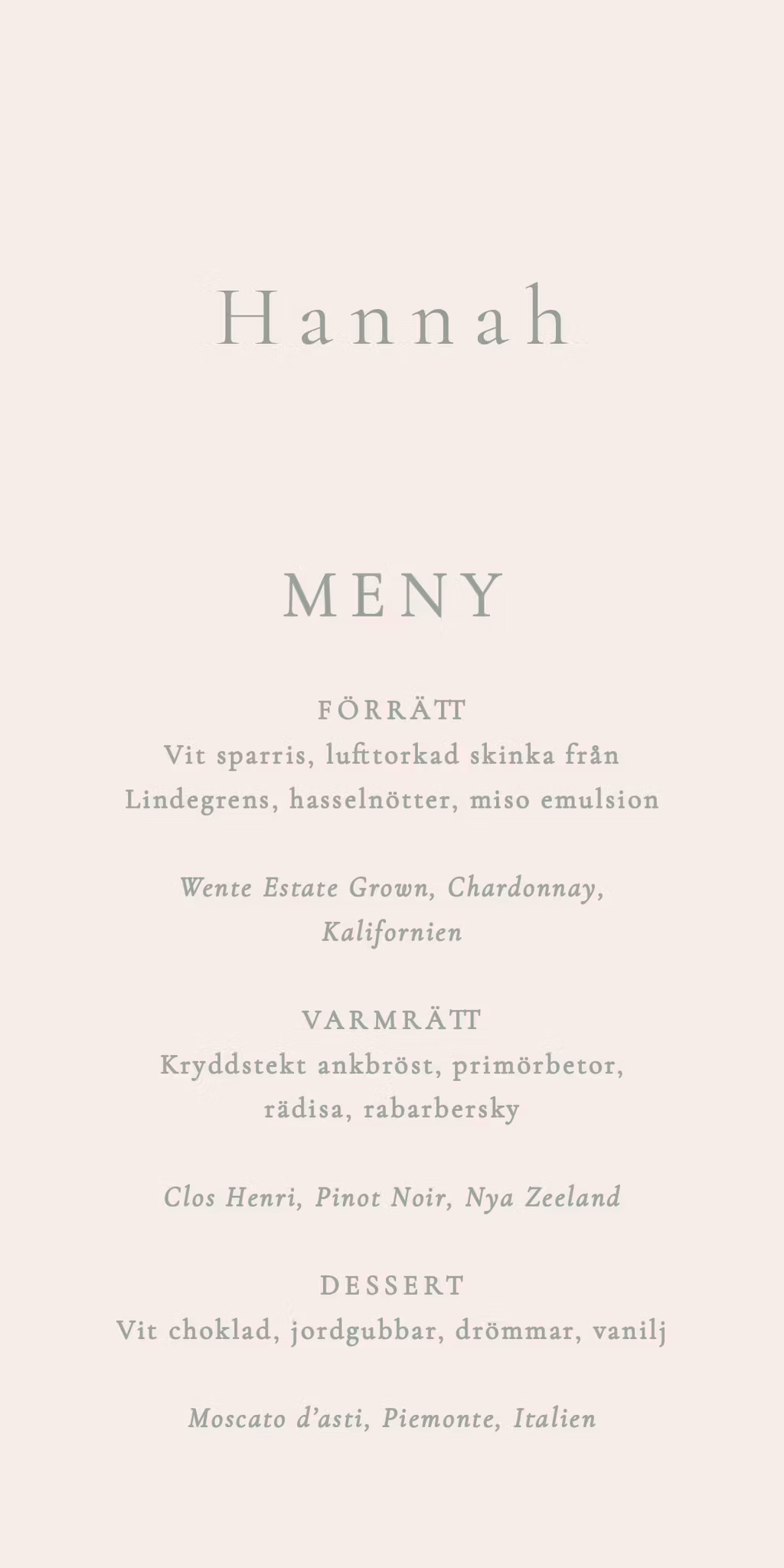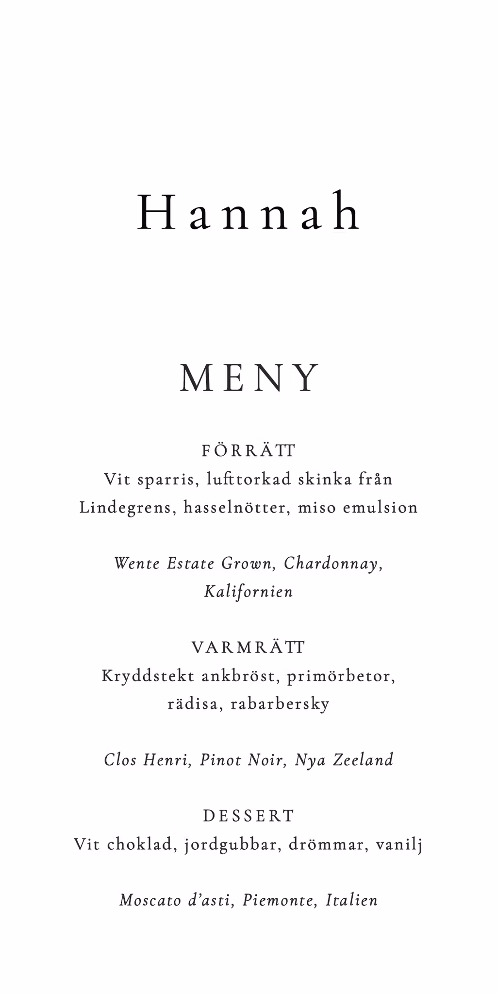 Dekorera dukningen med vackra menykort. På denna meny så trycks även gästens namn högst upp på menyn. Menyerna trycks på matt premiumpapper i storlek 10x21 cm.