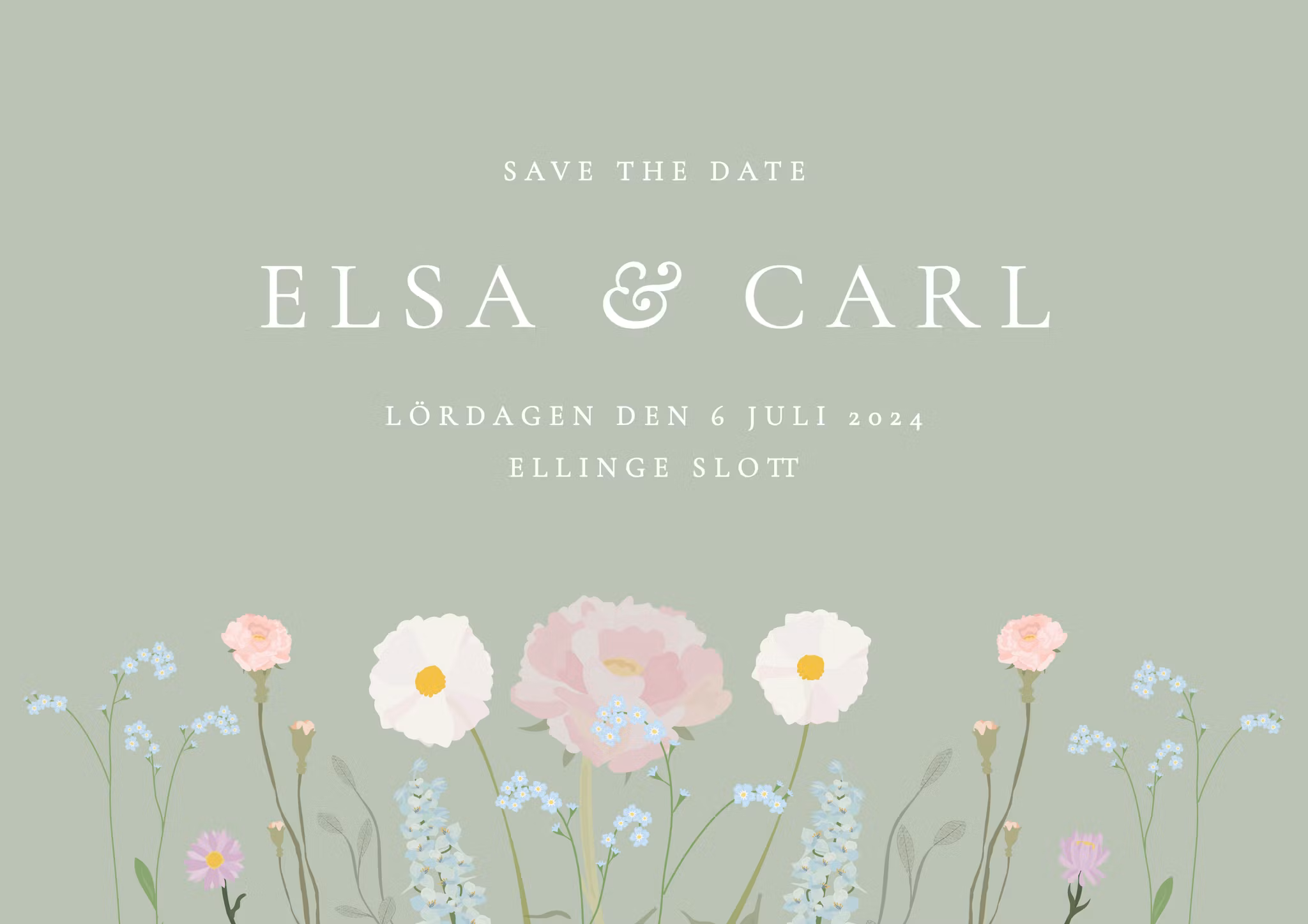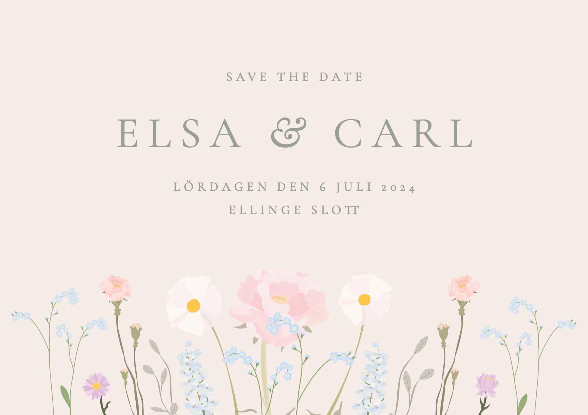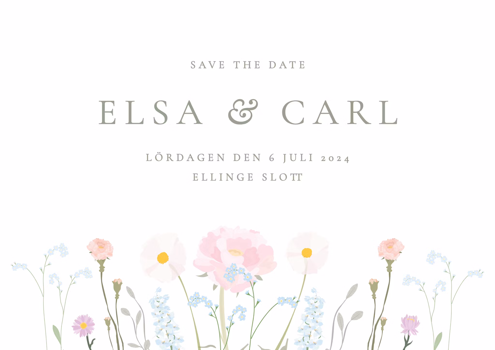 I denna romantiska Save the Date möts gästen av en äng sommarblommor i pastell som sätter stilen på bröllopet. Perfekt för det bohemiska bröllopet!