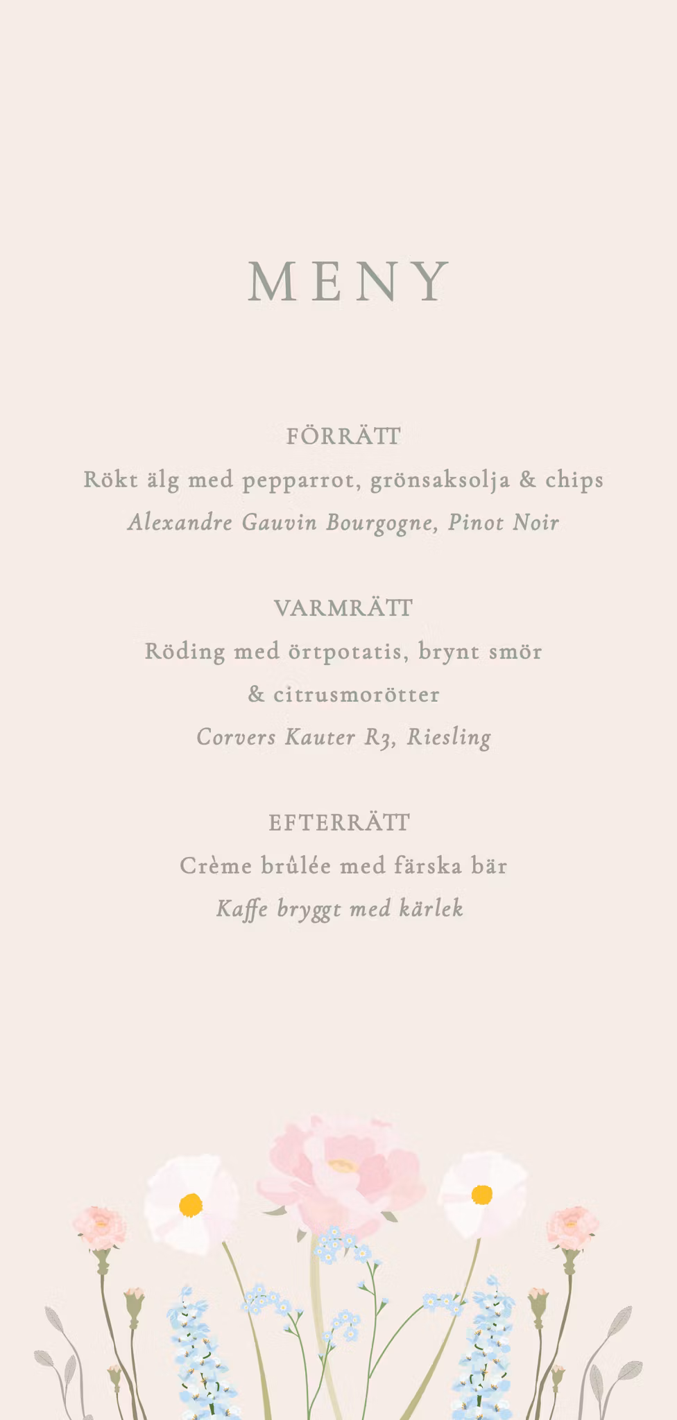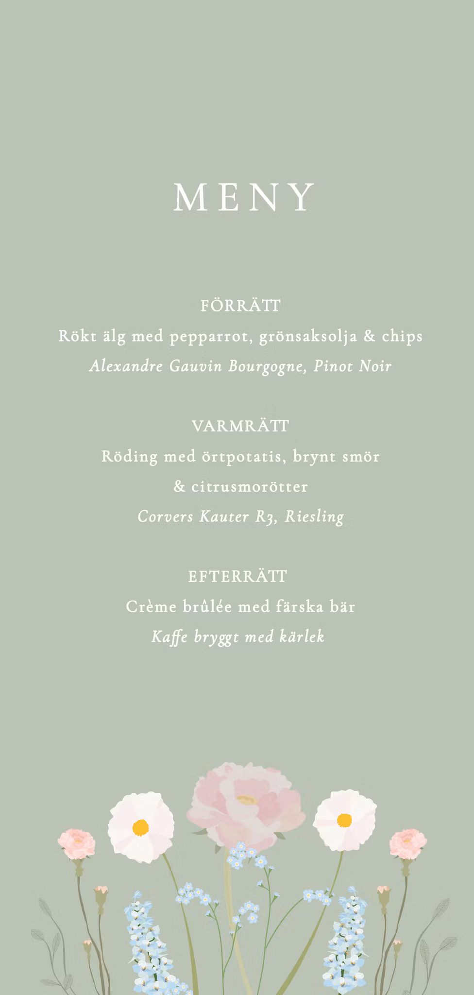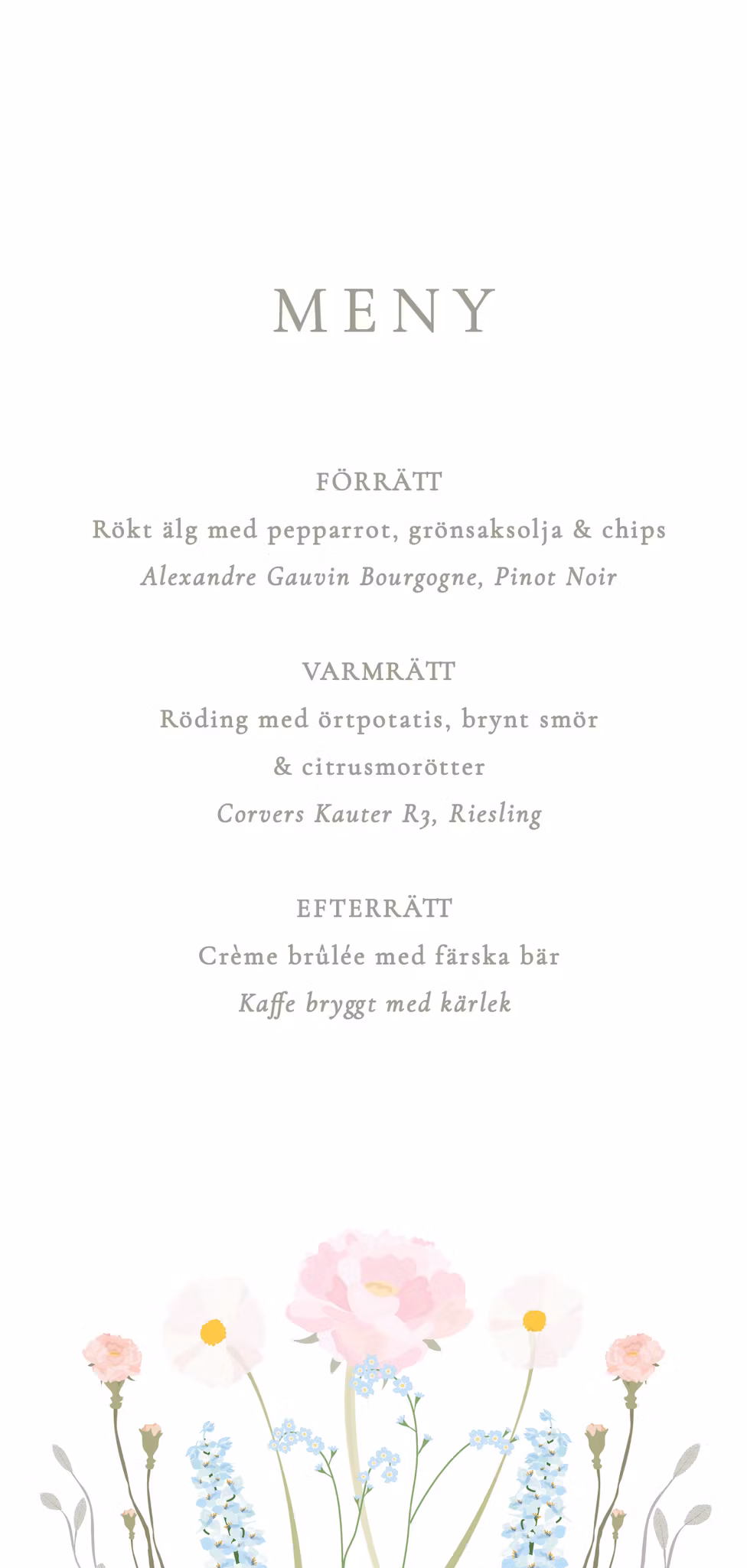Dekorera dukningen med vackra menykort. Placera ett på varje tallrik med ett personligt placeringskort som fästs med ett vackert sidenband eller placera menykorten mitt på borden. Menyerna trycks på matt premiumpapper. Gör dagen extra speciell med matchande trycksaker som placeringskort, välkomstskylt och placeringskarta.