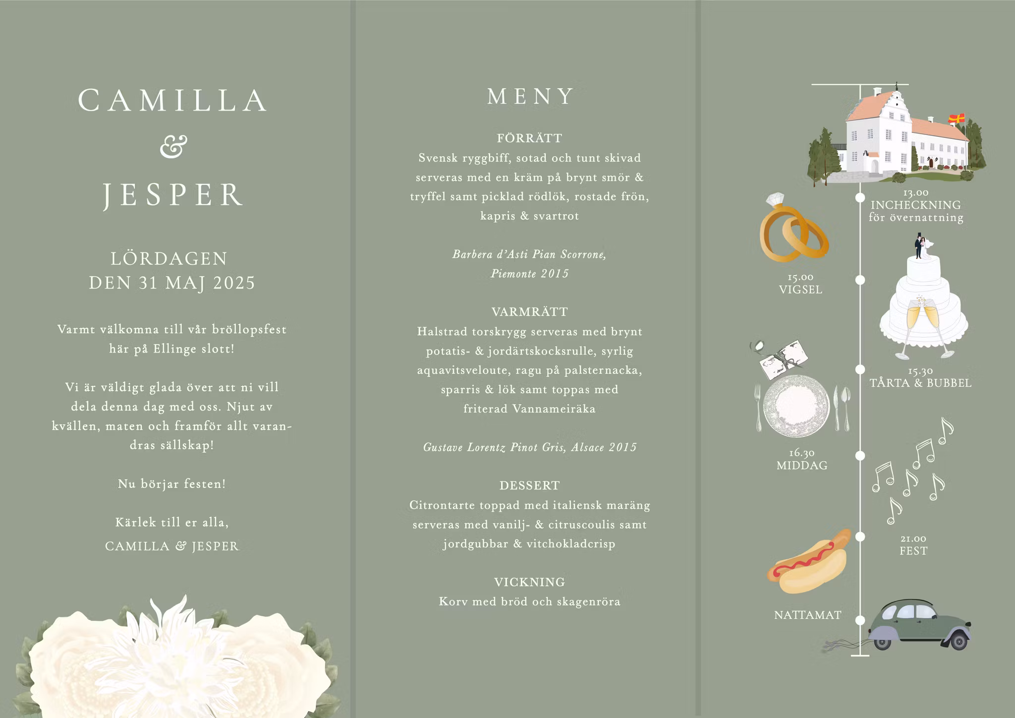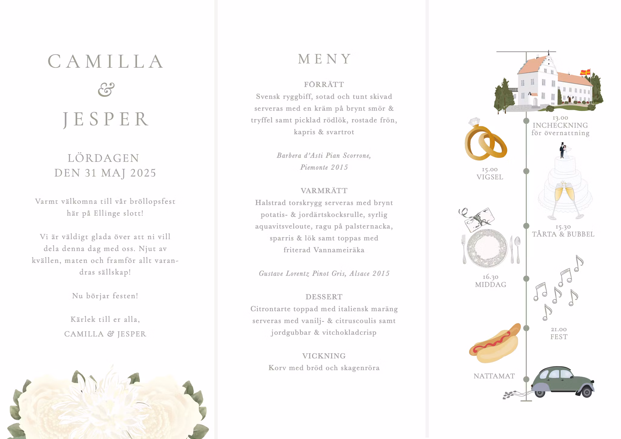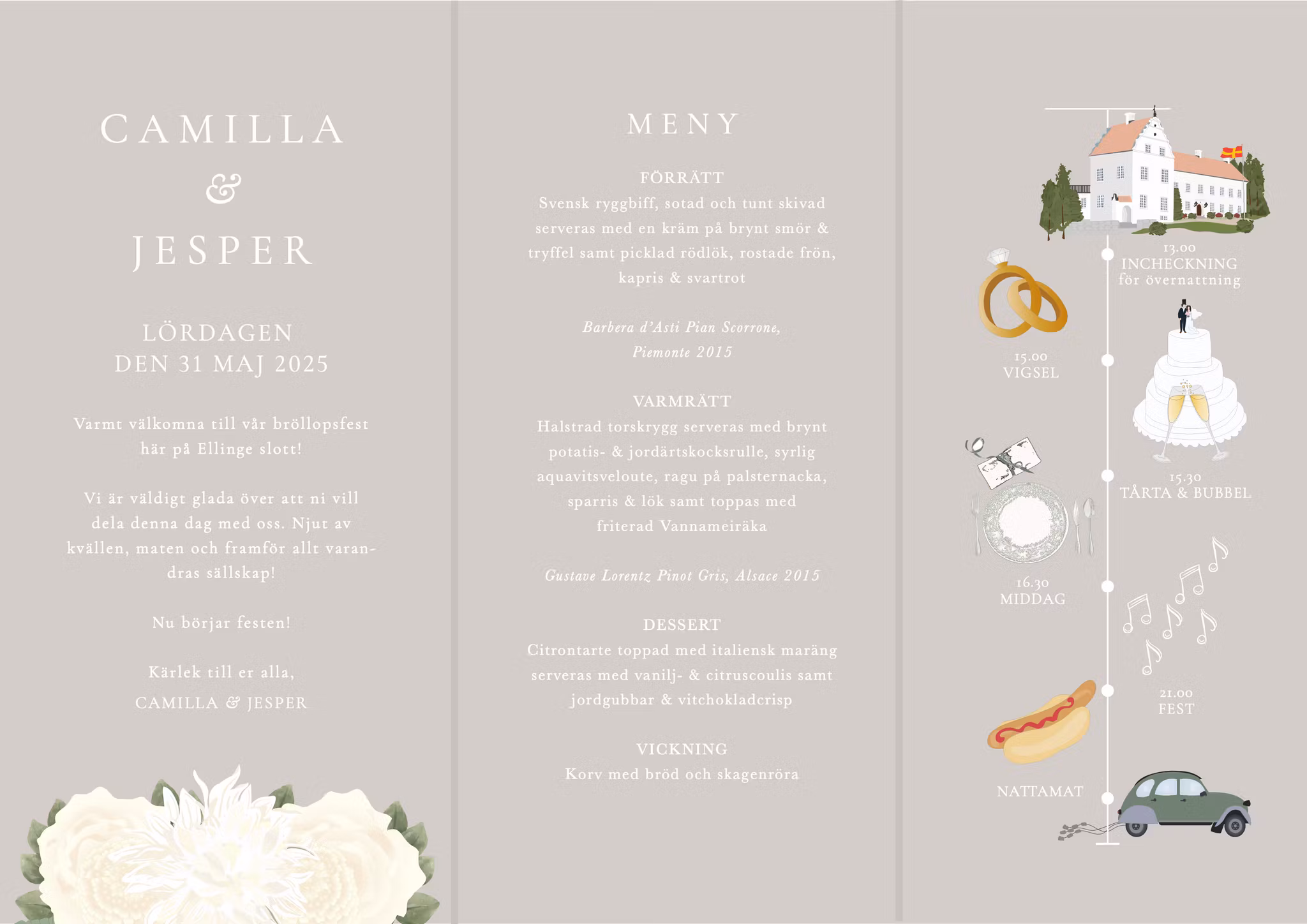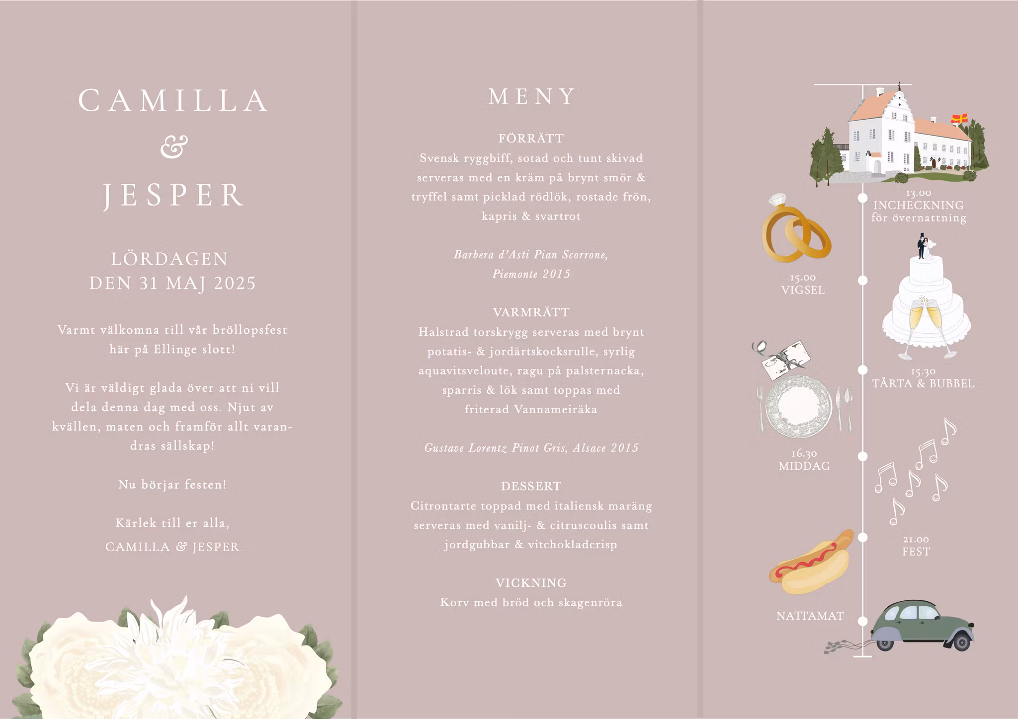 Förslag på innehåll: Personlig tidslinje över er kärlekssaga (från första mötet till er bröllopsdag), Bröllopsbingo, utmaningar under kvällens gång, tidslinje över dagen, sånger, meny, vett & etikett, alla gästers namn och statistik bland bröllopsgästerna (ålder, gifta, kön osv).