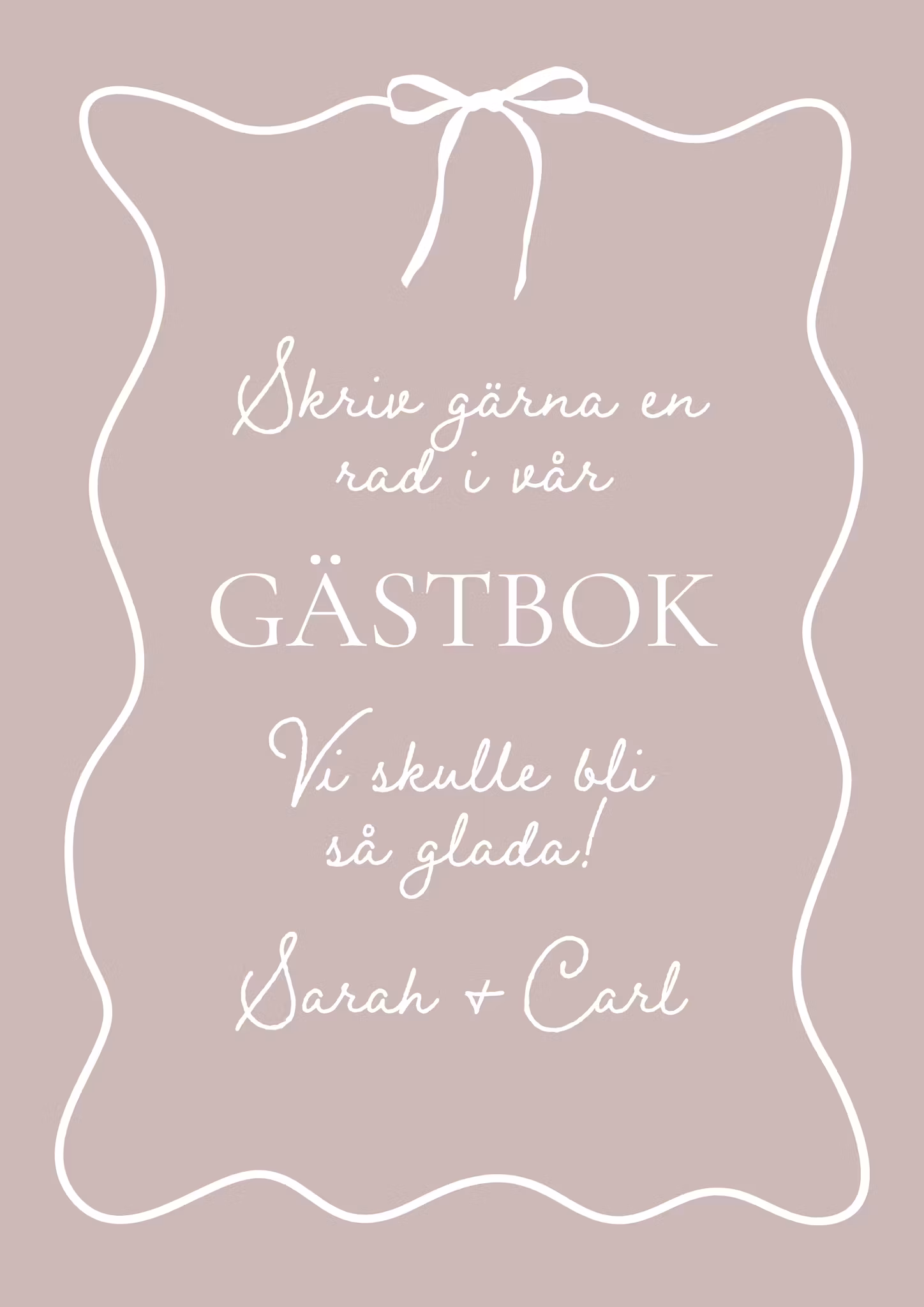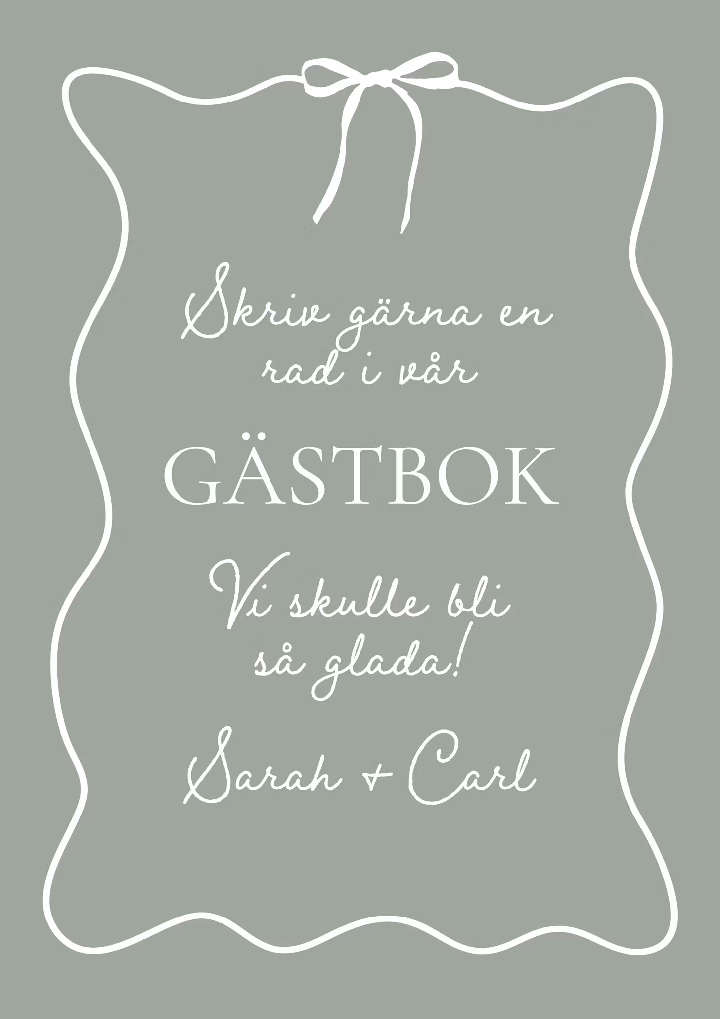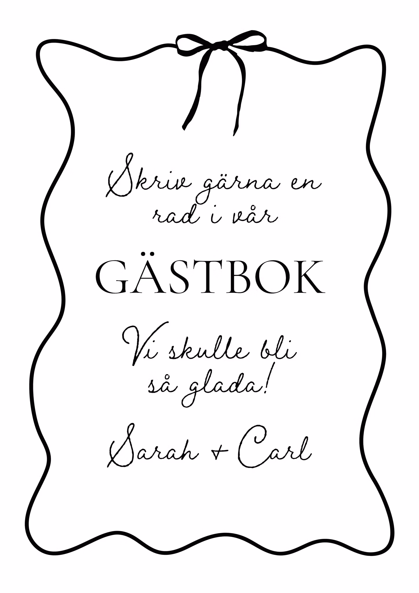 Låt era gäster skriva en rad i en gästbok, använd kameror eller ett personligt brev som minne av bröllopsdagen. Ett roligt minne att spara och en rolig stund för brudparet att titta igenom efter bröllopsdagen. Med tydliga skyltar så kan inte gästerna missa detta roliga tillfälle! Skylten går att beställa i storlekarna 21x30 cm (A4) eller 30x42 (A3) cm på matt premiumpapper.