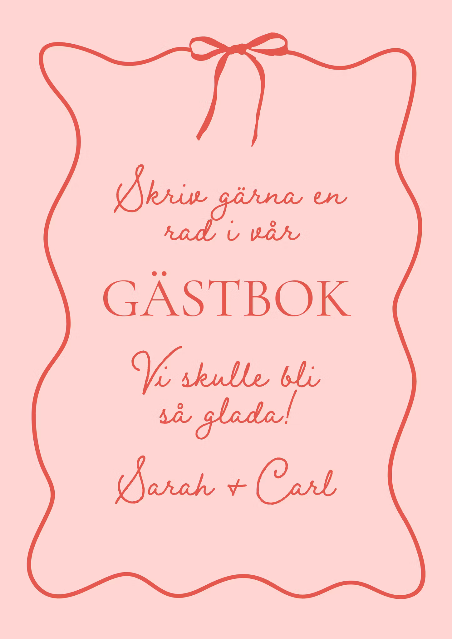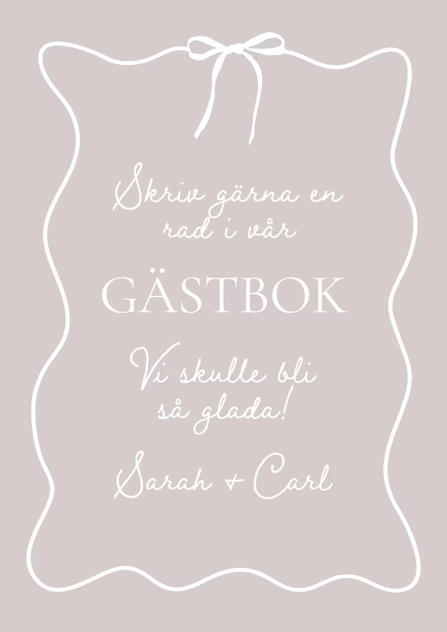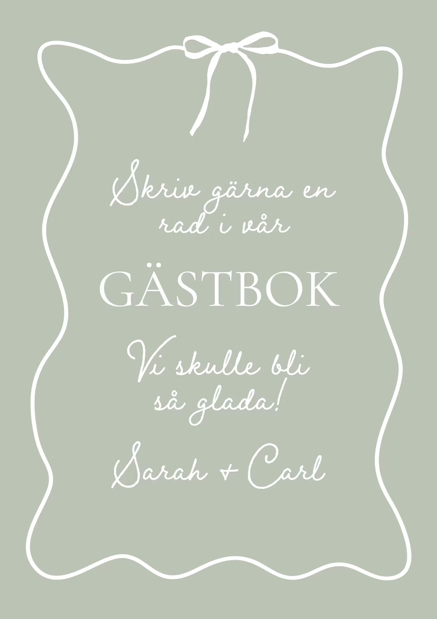 Låt era gäster skriva en rad i en gästbok, använd kameror eller ett personligt brev som minne av bröllopsdagen. Ett roligt minne att spara och en rolig stund för brudparet att titta igenom efter bröllopsdagen. Med tydliga skyltar så kan inte gästerna missa detta roliga tillfälle! Skylten går att beställa i storlekarna 21x30 cm (A4) eller 30x42 (A3) cm på matt premiumpapper.