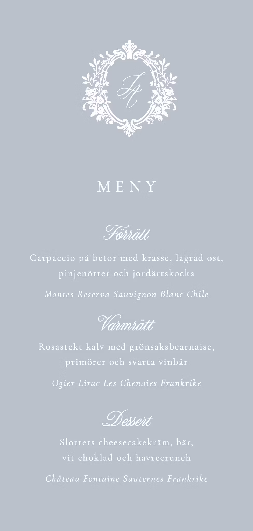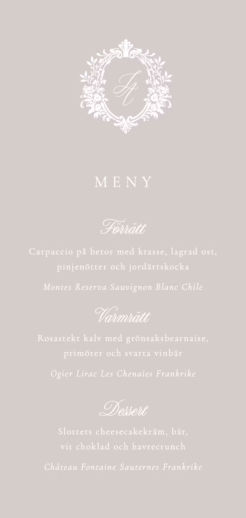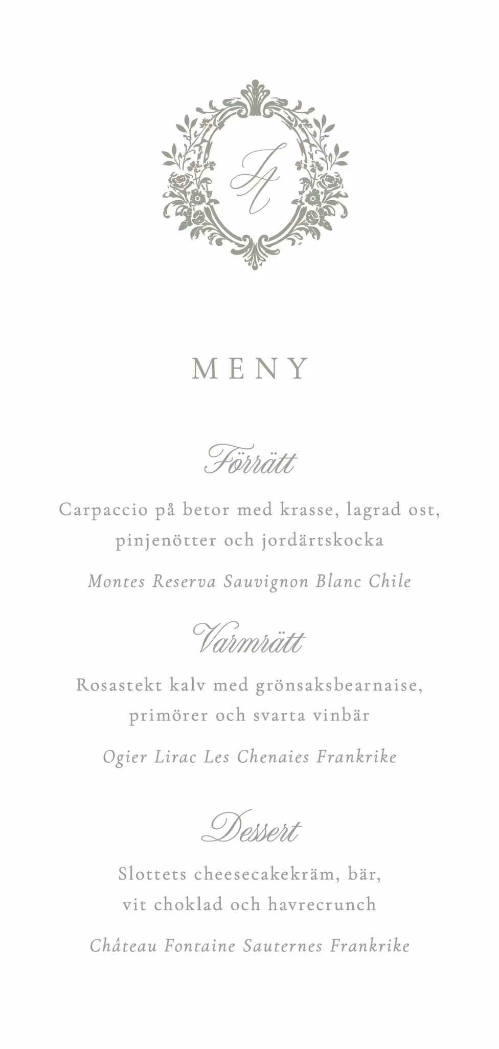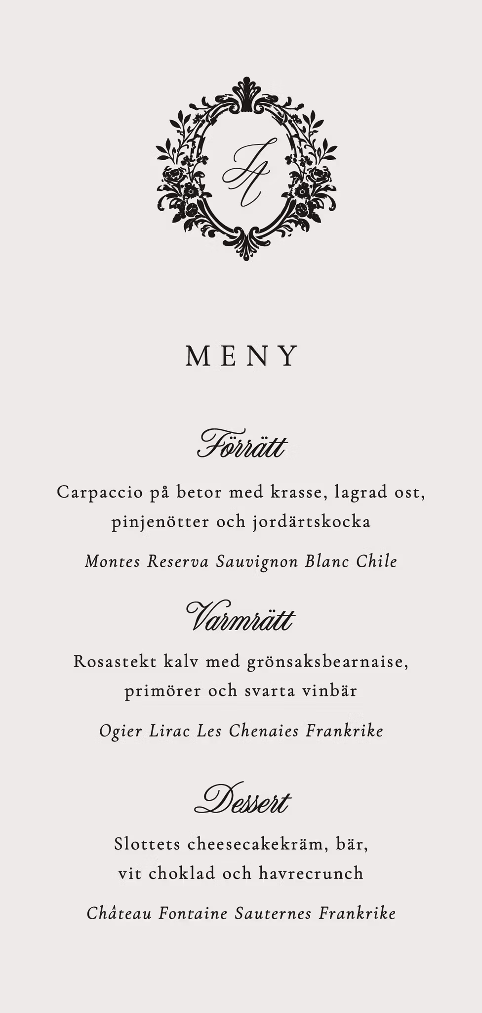 En minimalistisk och stilren meny som är perfekt för det klassiska bröllopet och dekoren. Placera en meny på varje tallrik med ett personligt placeringskort som fästs med ett vackert sidenband eller placera menykorten mitt på borden. Menyn är i storleken 21x10 cm på matt premiumpapper. Gör dagen extra speciell med matchande trycksaker som placeringskort, välkomstskylt och placeringskarta.