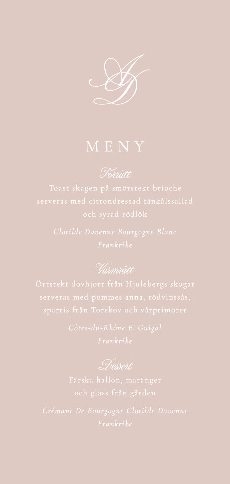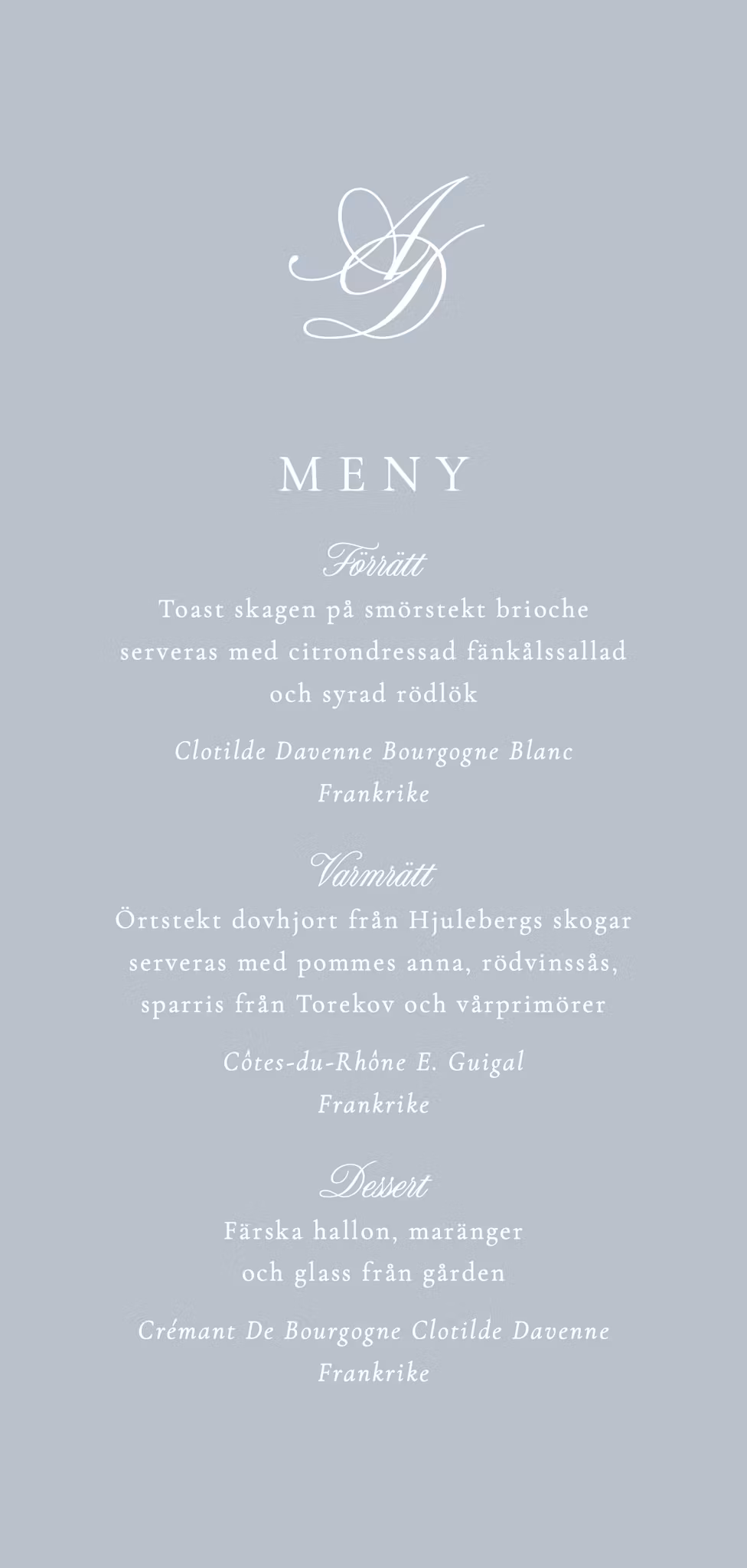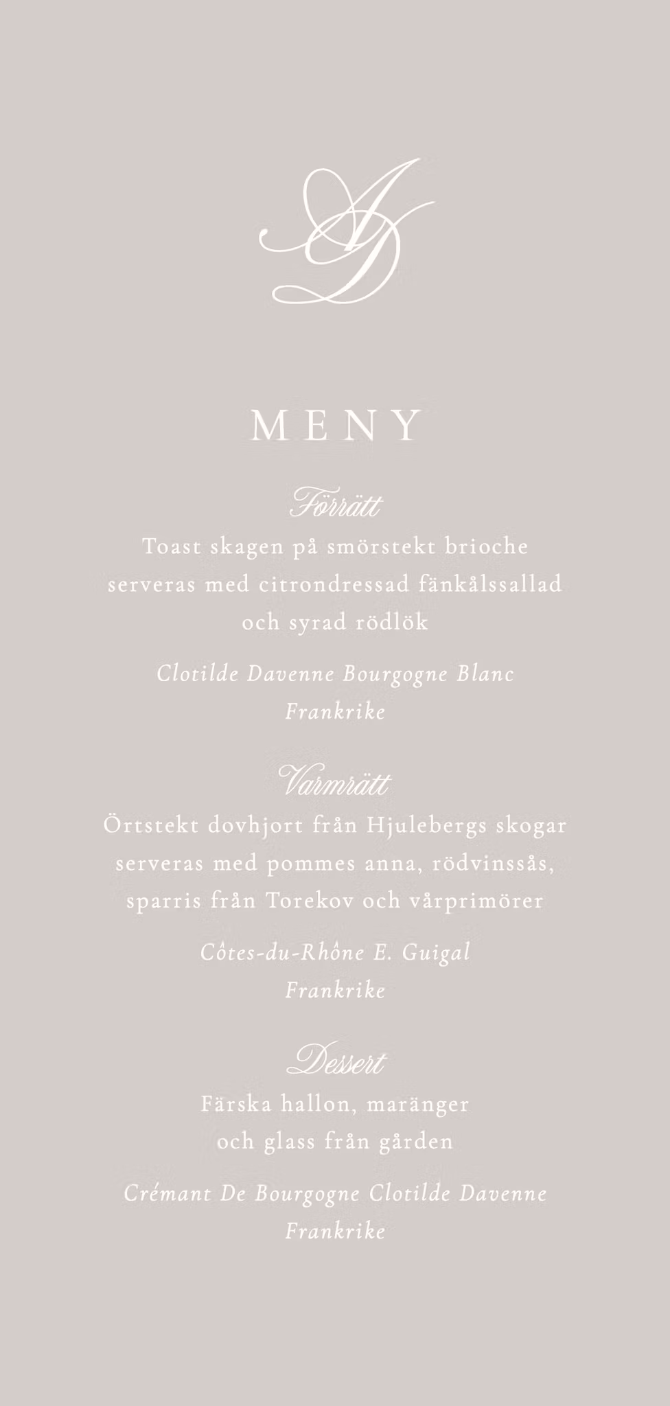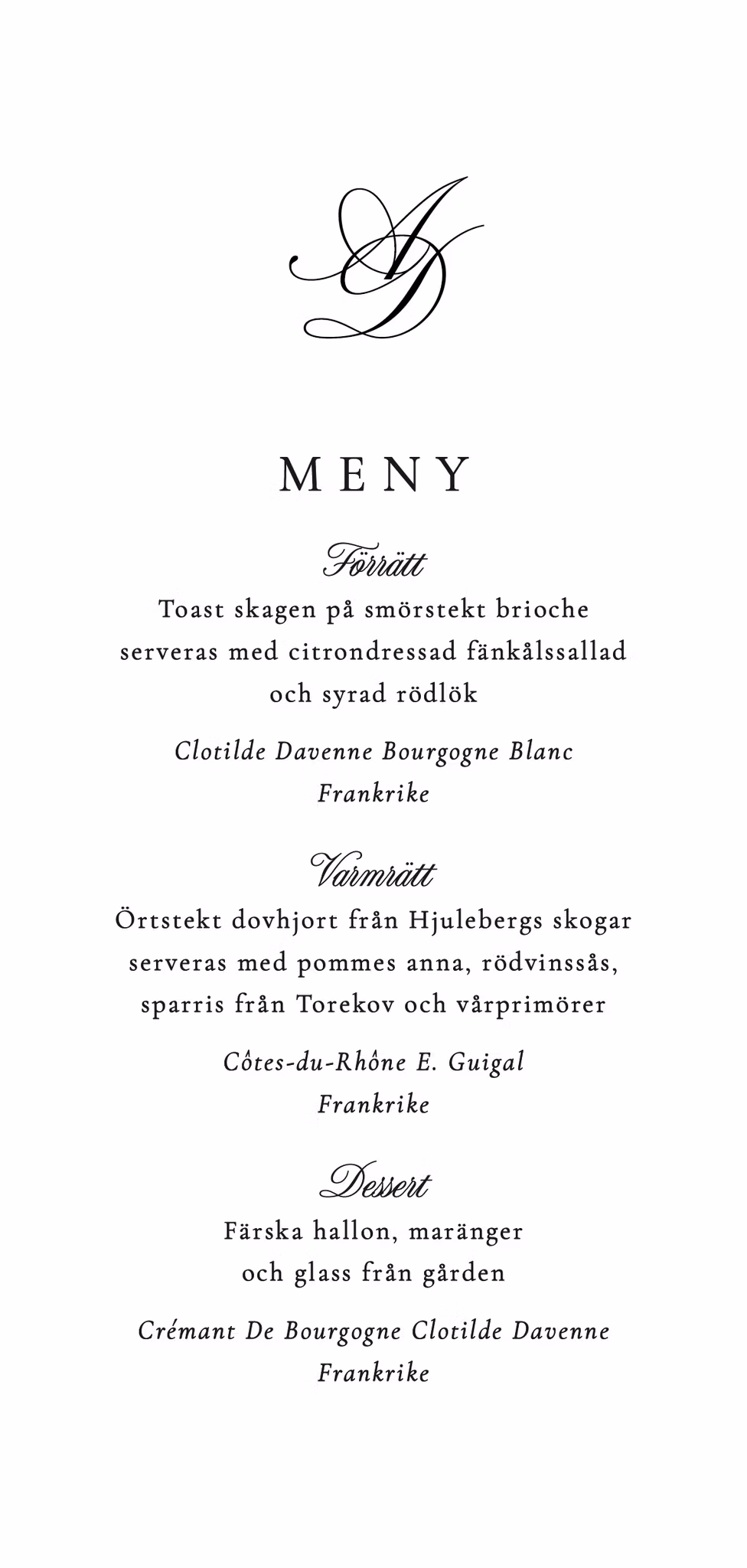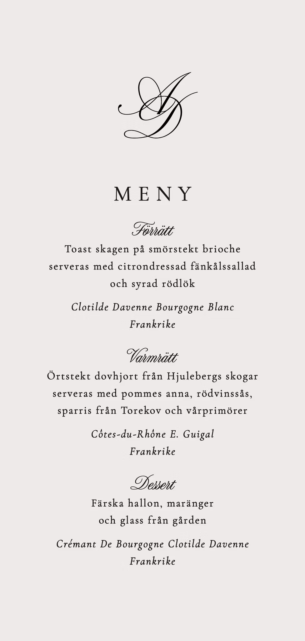 En minimalistisk och stilren meny som är perfekt för det klassiska bröllopet och dekoren. Placera en meny på varje tallrik med ett personligt placeringskort som fästs med ett vackert sidenband eller placera menykorten mitt på borden. Menyn är i storleken 21x10 cm på matt premiumpapper. Gör dagen extra speciell med matchande trycksaker som placeringskort, välkomstskylt och placeringskarta.