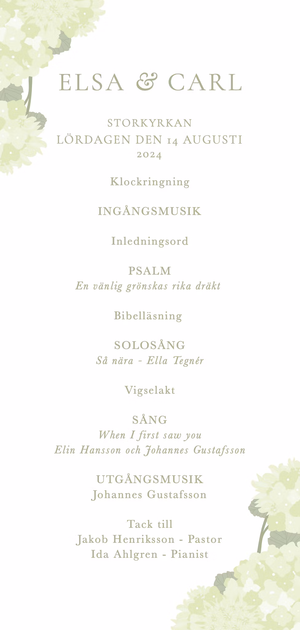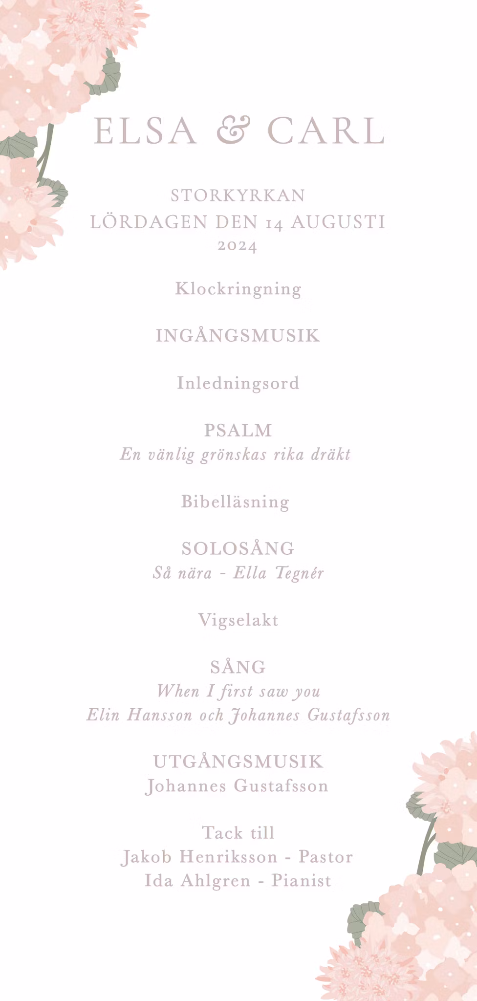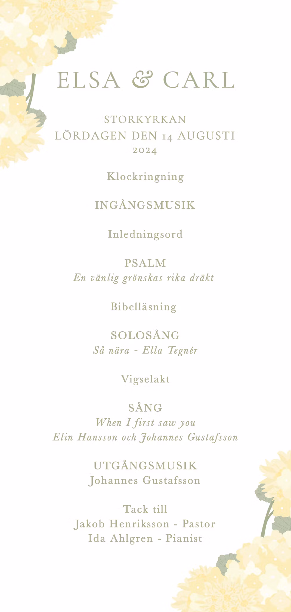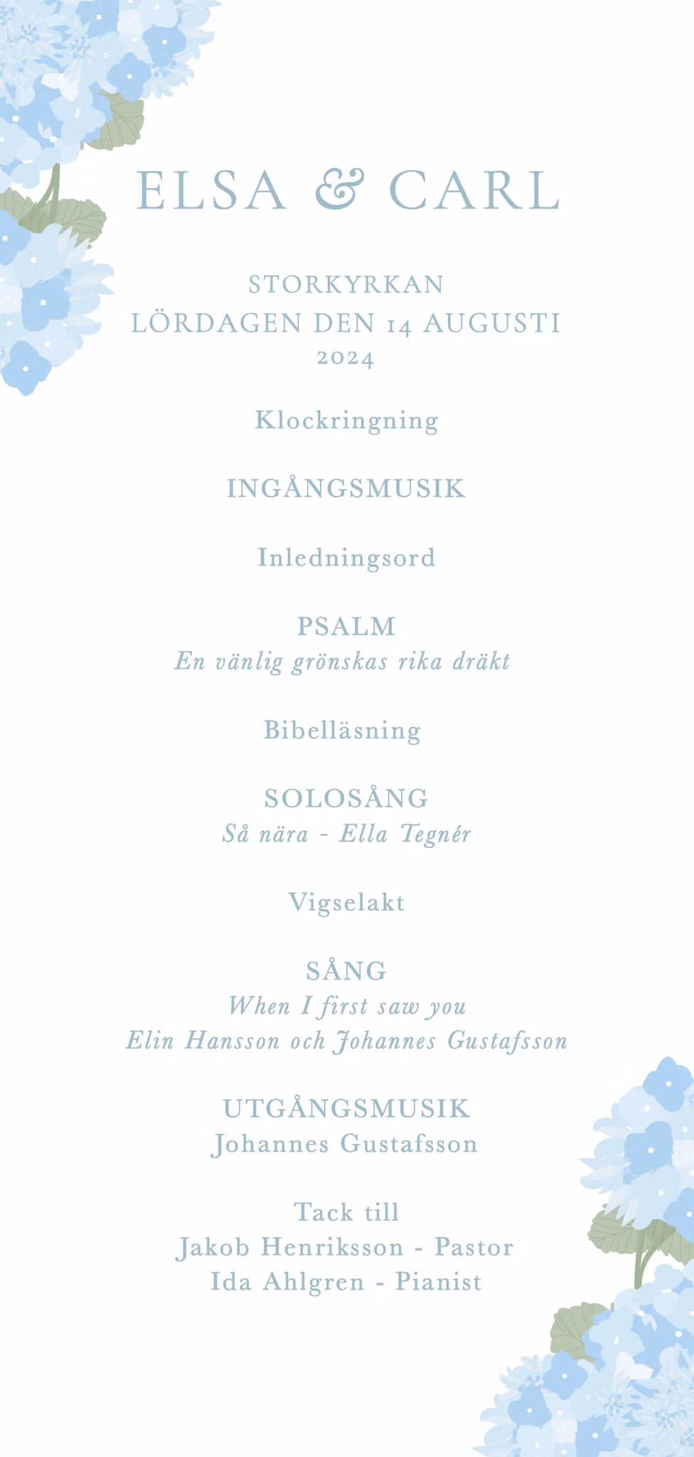 Vigselprogrammet är i storleken 10x21 cm och trycks på matt premiumpapper. Gör dagen extra speciell med matchande trycksaker som placeringskort, välkomstskylt och placeringskarta.