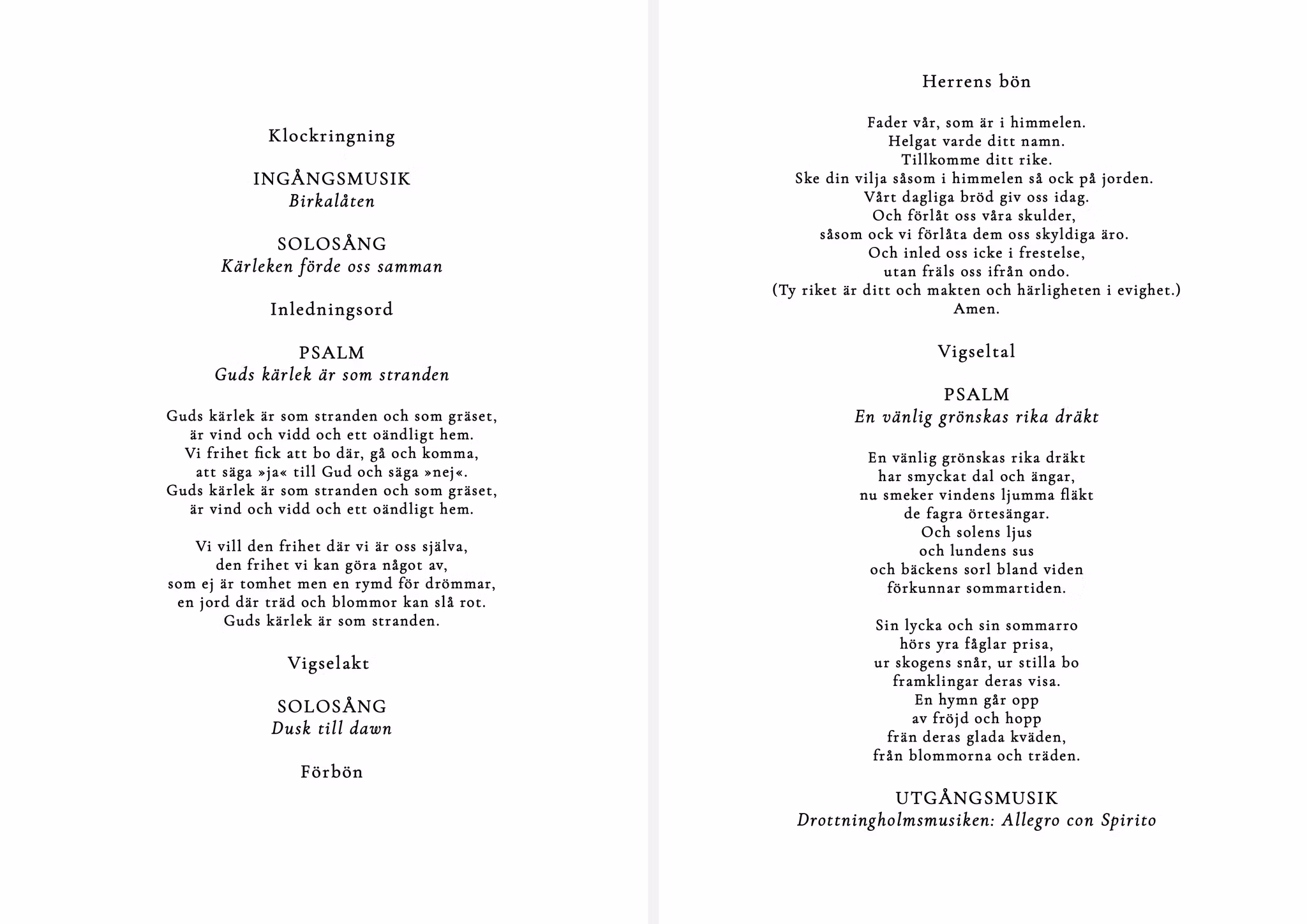 Förgyll dagen och låt trycka upp personliga vigselhäften till vigseln. Fyll den med innehåll som passar just er, personliga inslag och andra element som ni tror kommer förhöja stämningen bland era gäster. Häftet har en framsida/baksida där du helt själv bestämmer designen som går i stil med er dekor. Formatet går att välja i storlek A6 (10,5x15 cm) eller A5 (15x21 cm). Om ni har ett långt program och vill skriva med texter på psalmer etc, rekommenderas det större formatet så texten inte blir för liten och svårläst. Häftet trycks på matt premiumpapper.