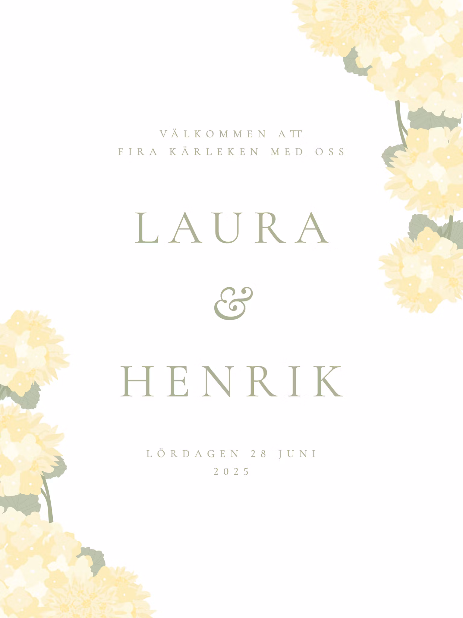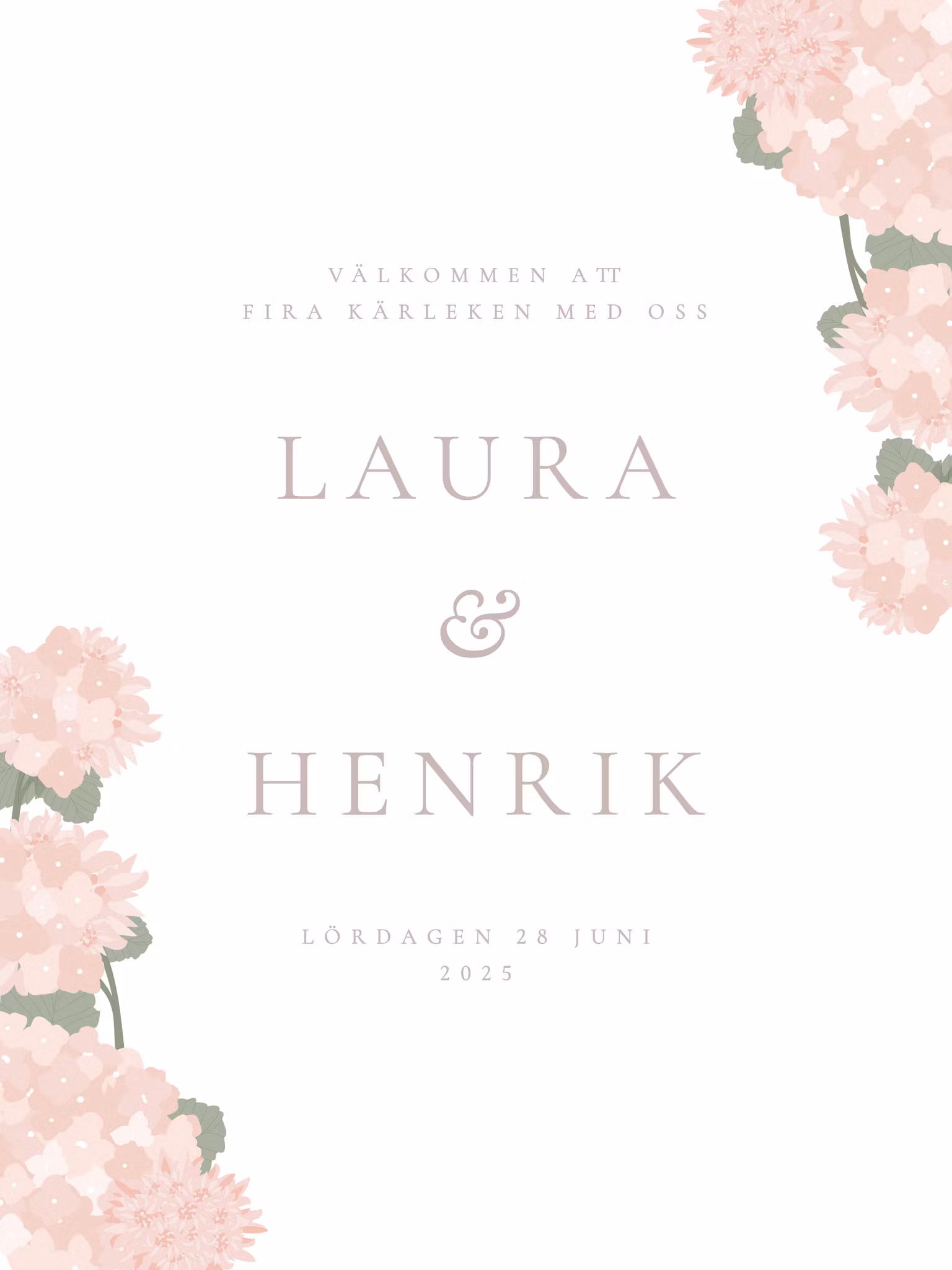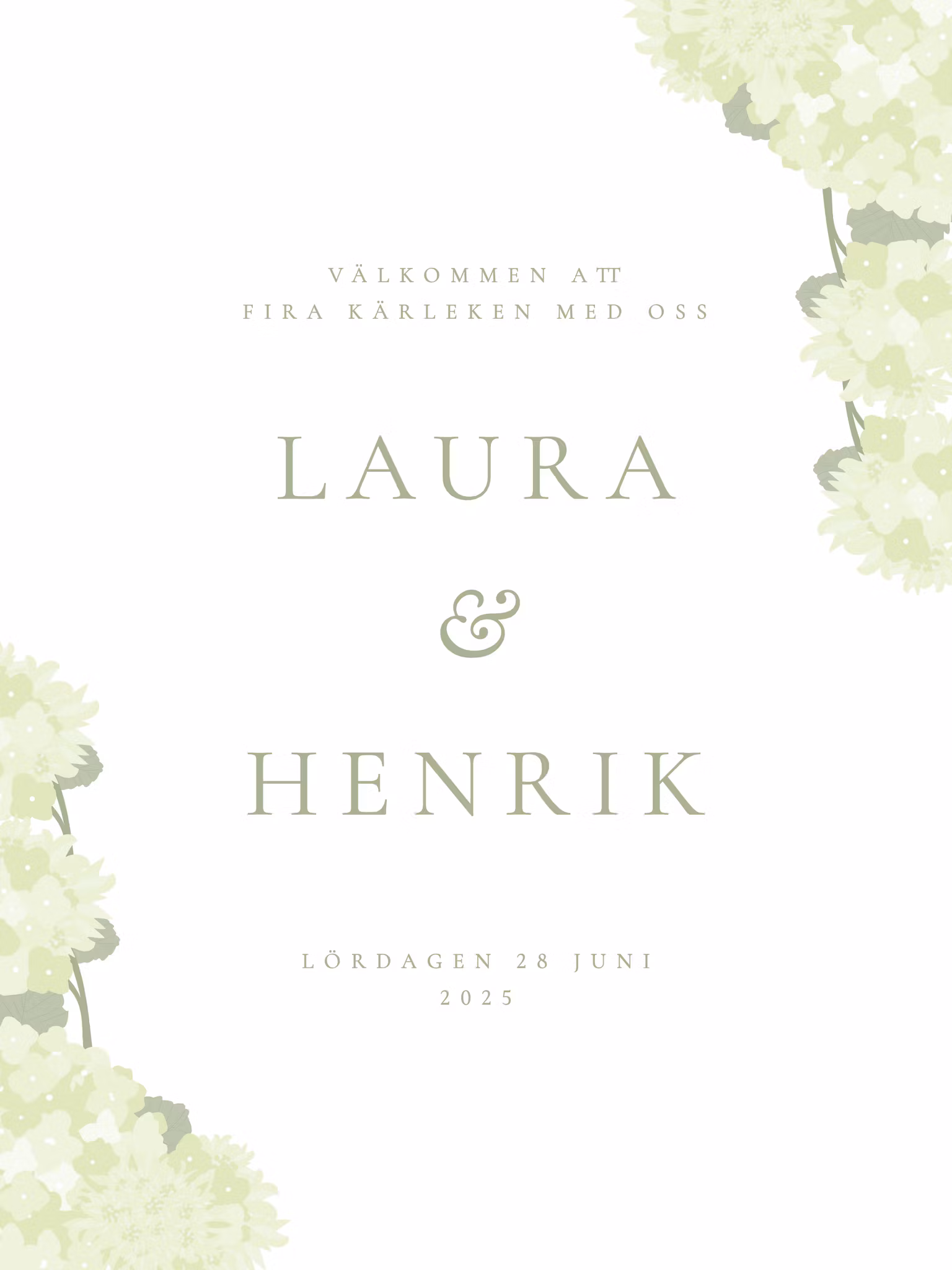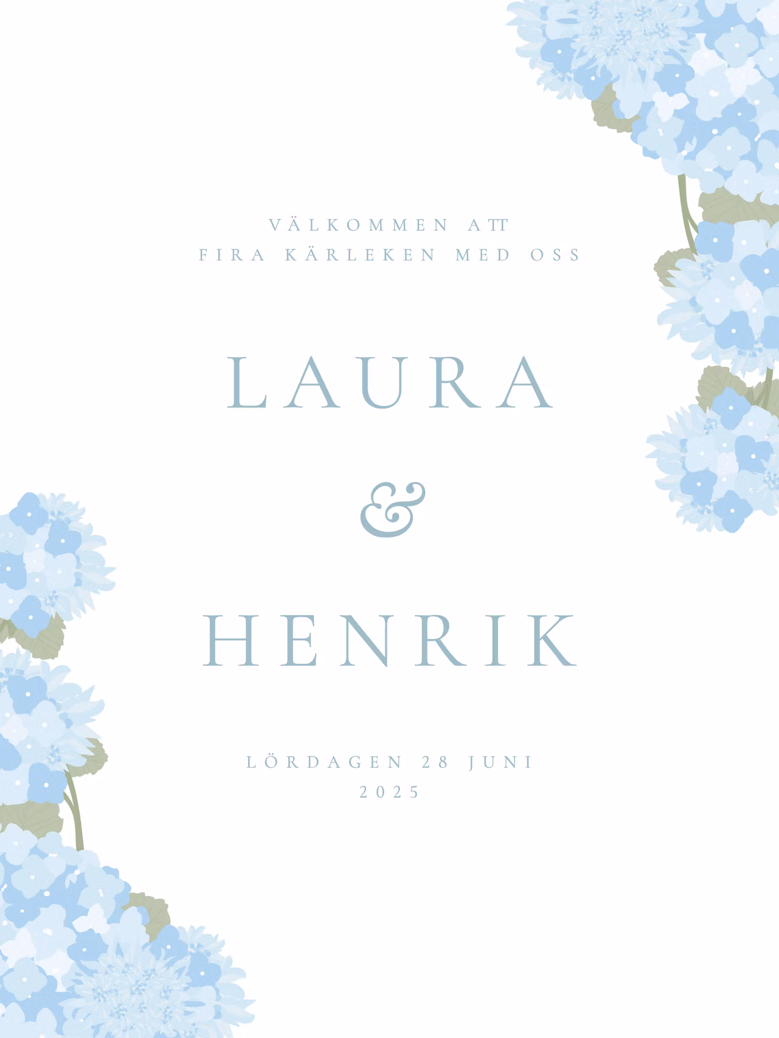 Välkomna era gäster med en personlig välkomstskylt dekorerad med vackra hortensior. Sätt den i en ram på ett staffli utanför kyrkan och låt den följa med under dagens gång. Ett fint minne att spara från er fantastiska dag.