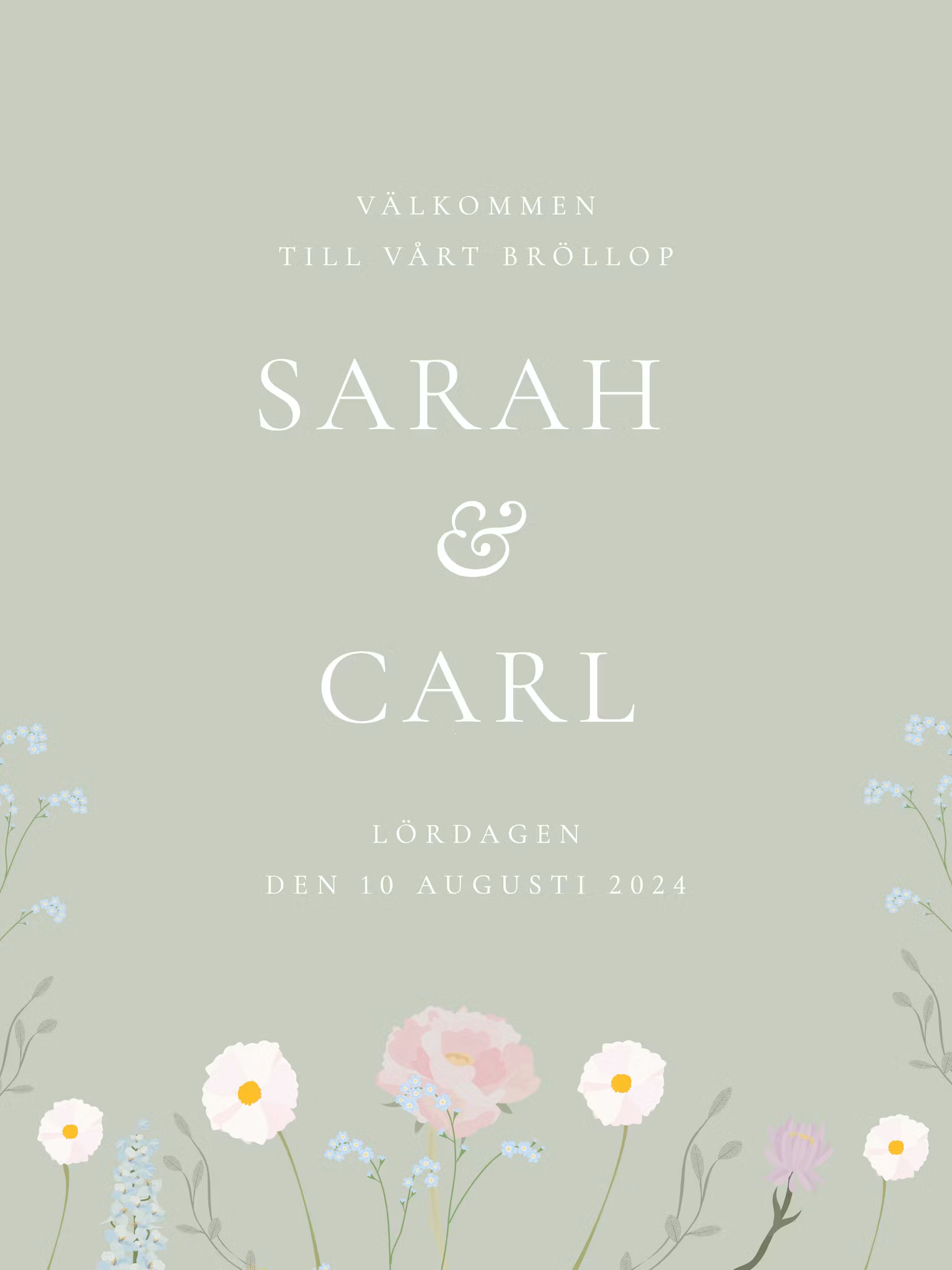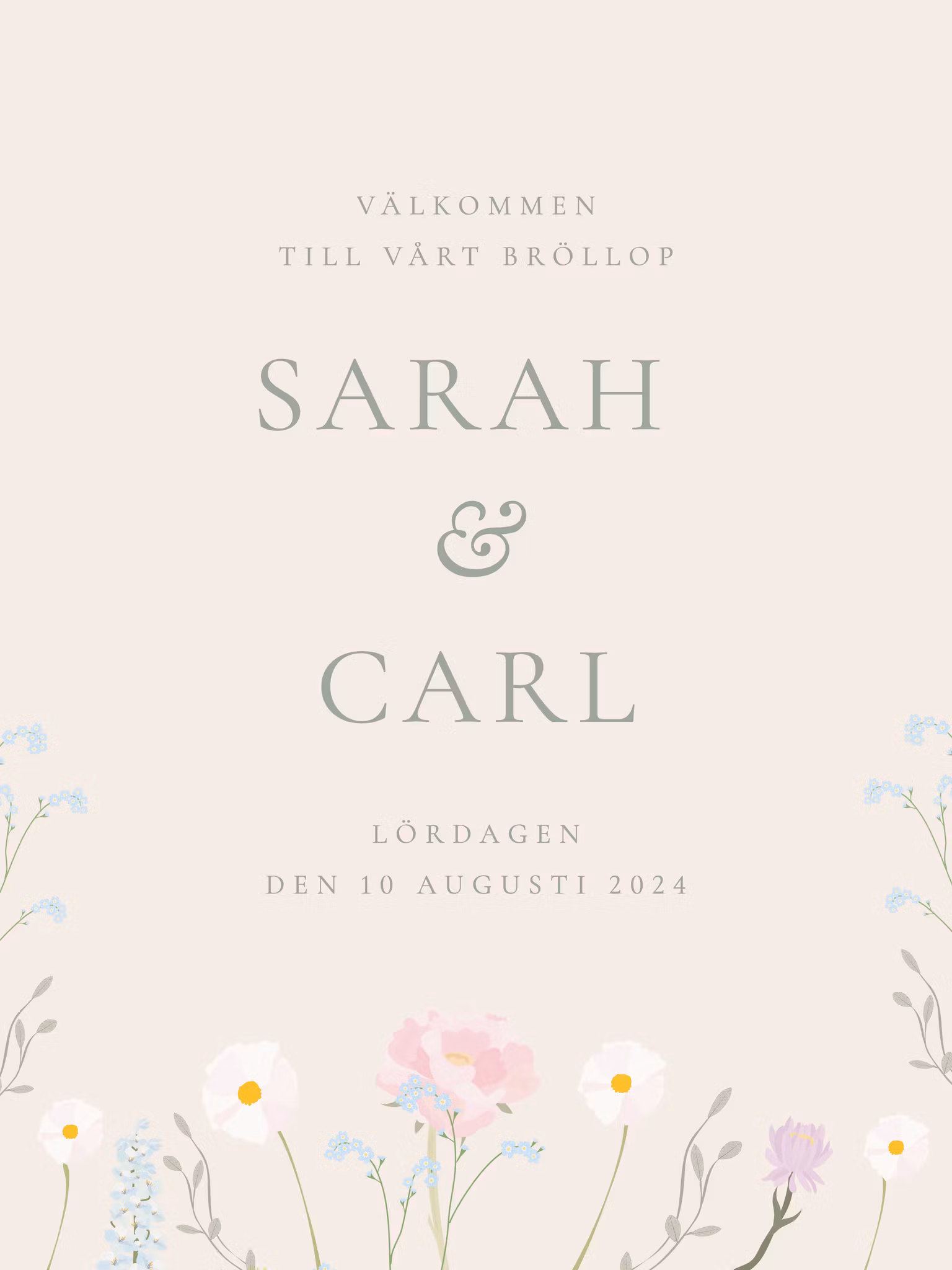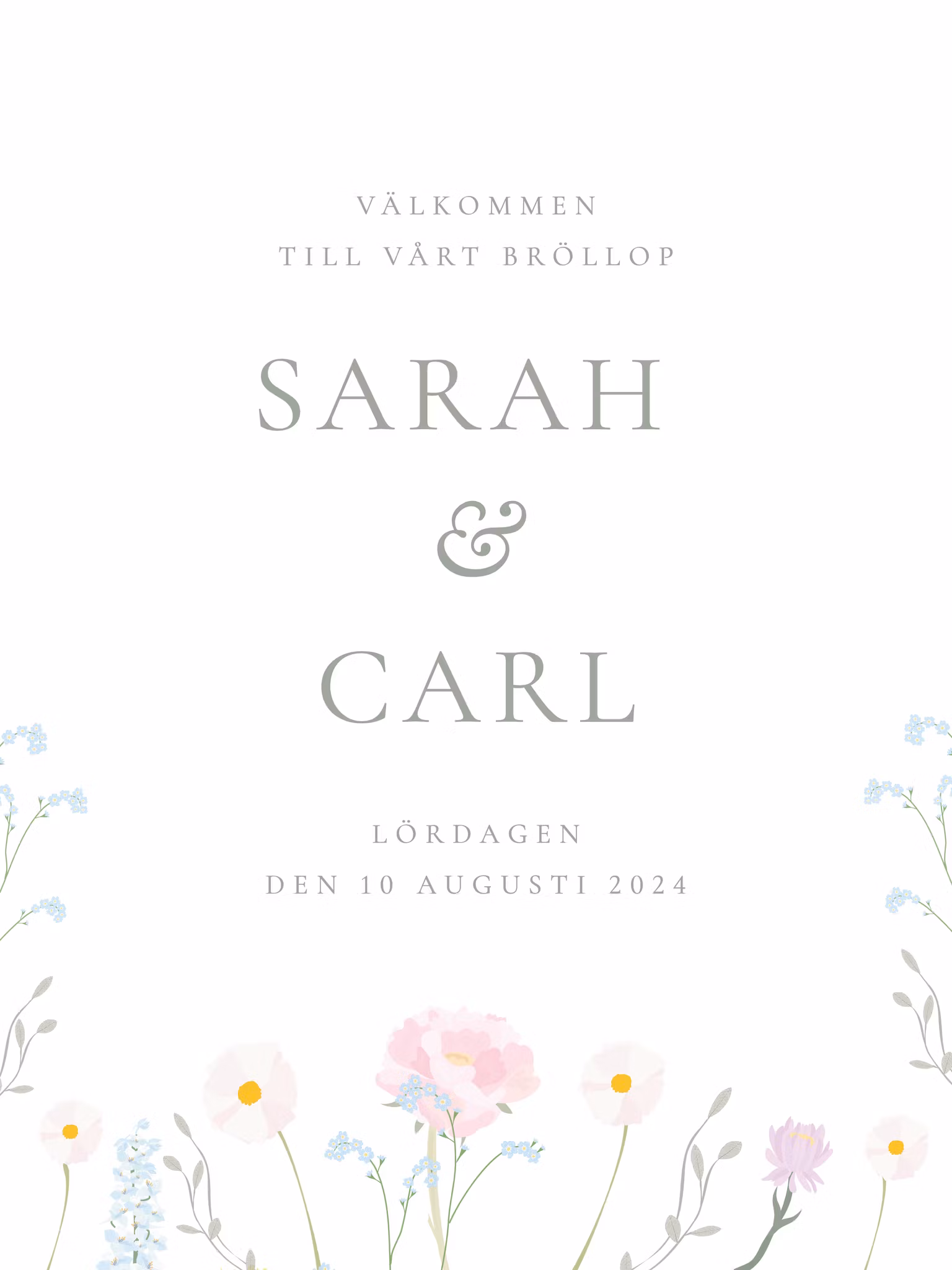 Välkomna era gäster med en välkomsttext som är inringade av illustrerade svenska sommarblommor. Sätt den i en ram på ett staffli utanför kyrkan och låt den följa med under dagens gång. Ett fint minne att spara från er fantastiska dag.