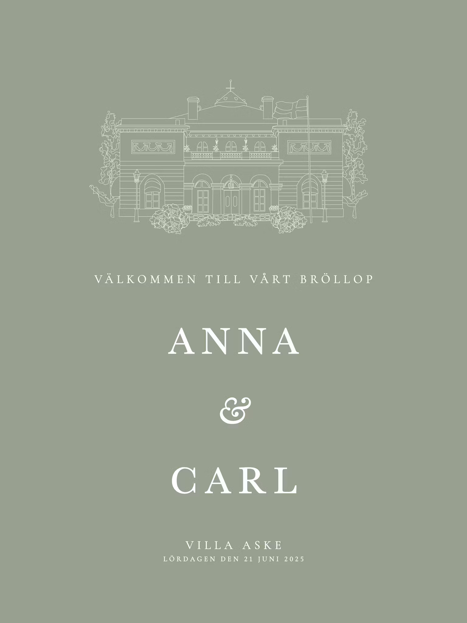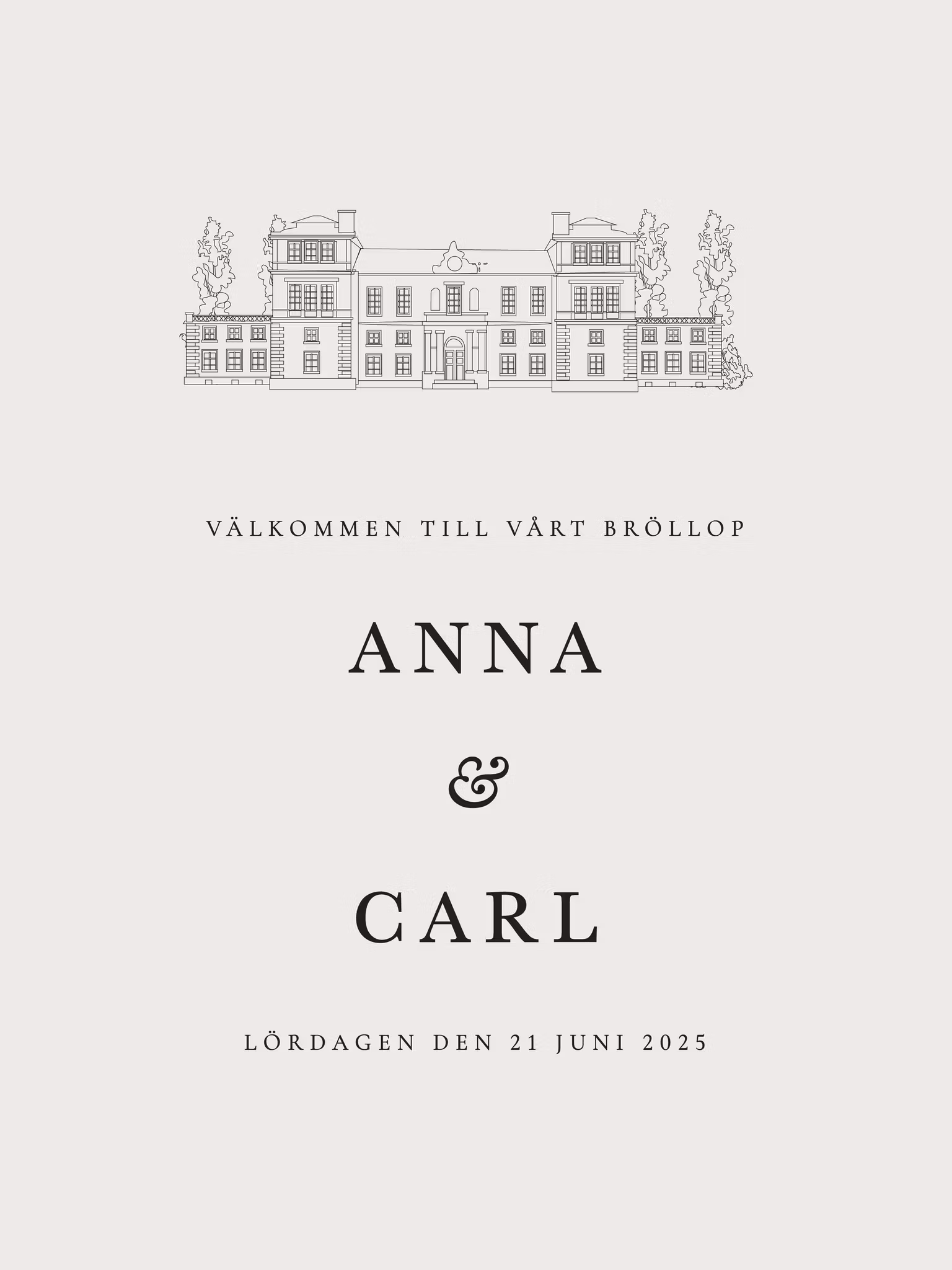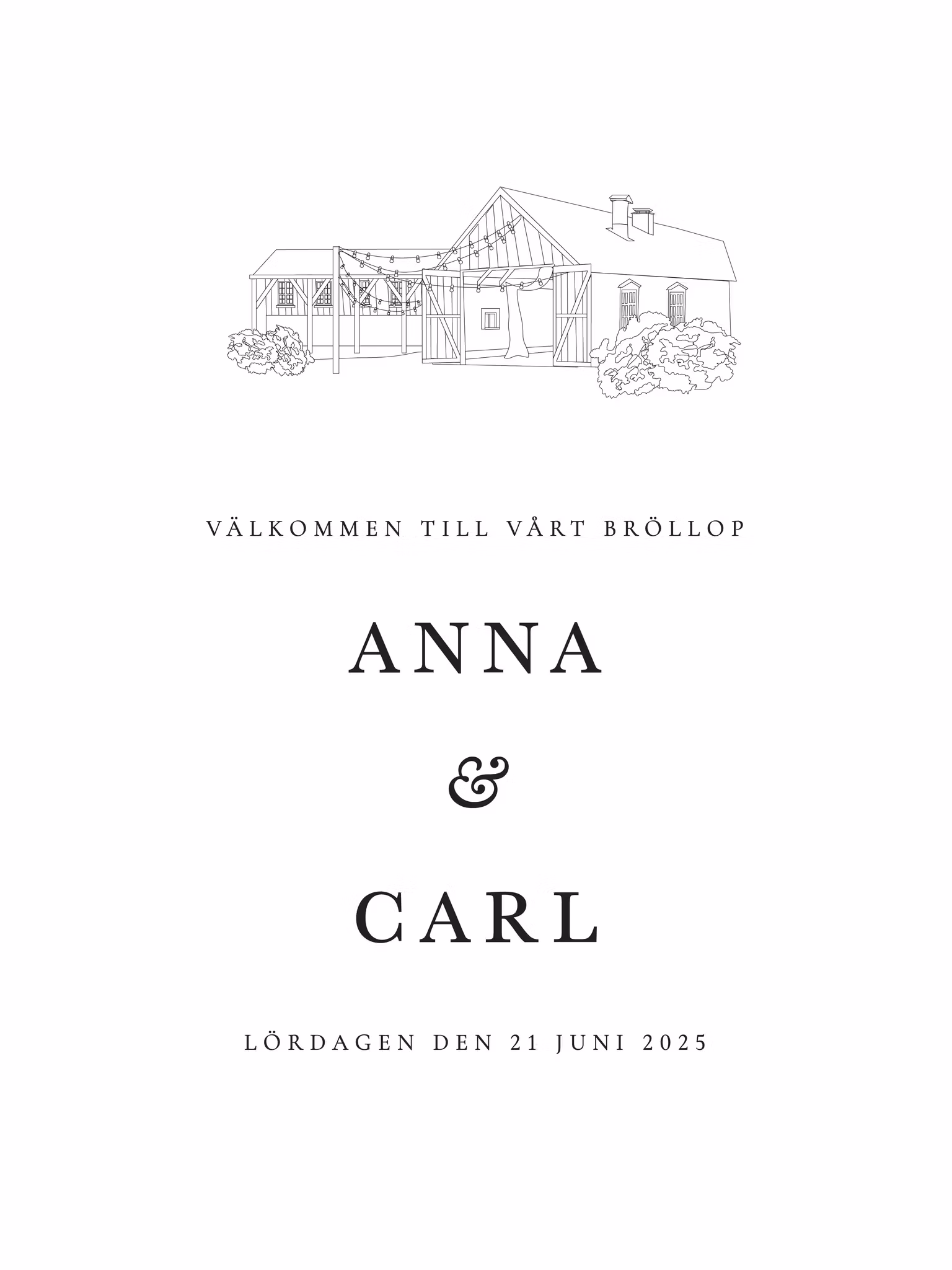Denna dubbelvikta bröllopsinbjudan med fram- och baksida med ett uppslag är perfekt för dig som har en speciell plats, lokal eller landskap som ska illustreras på framsidan av inbjudan. På uppslaget får det plats med mycket information eller om ni vill sätta upp dagen i form av en tidslinje eller dagsordning.