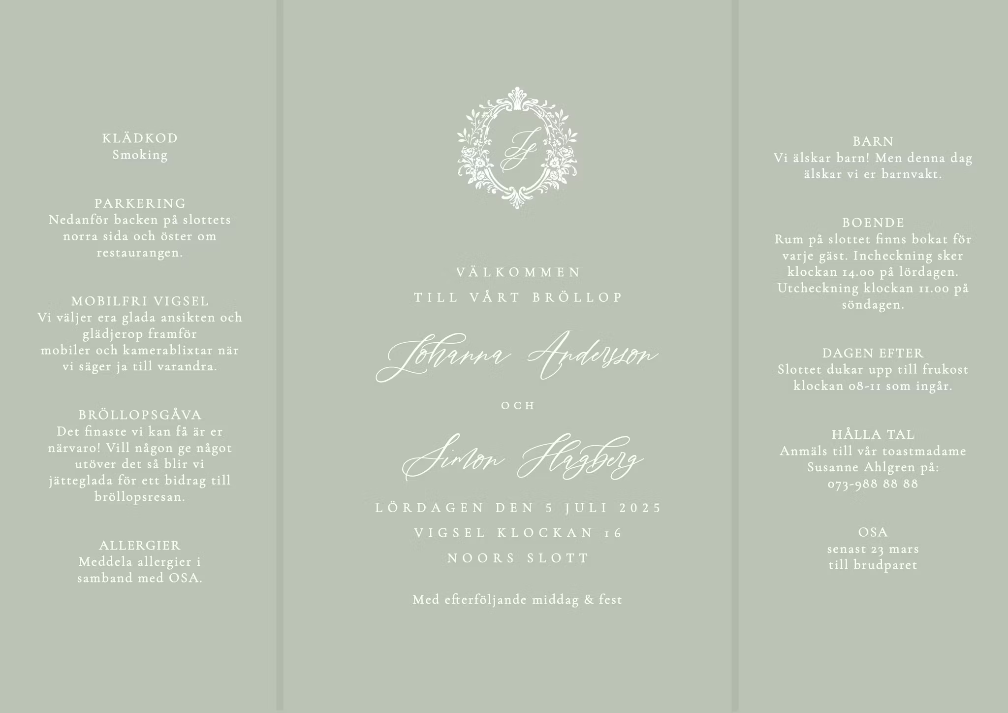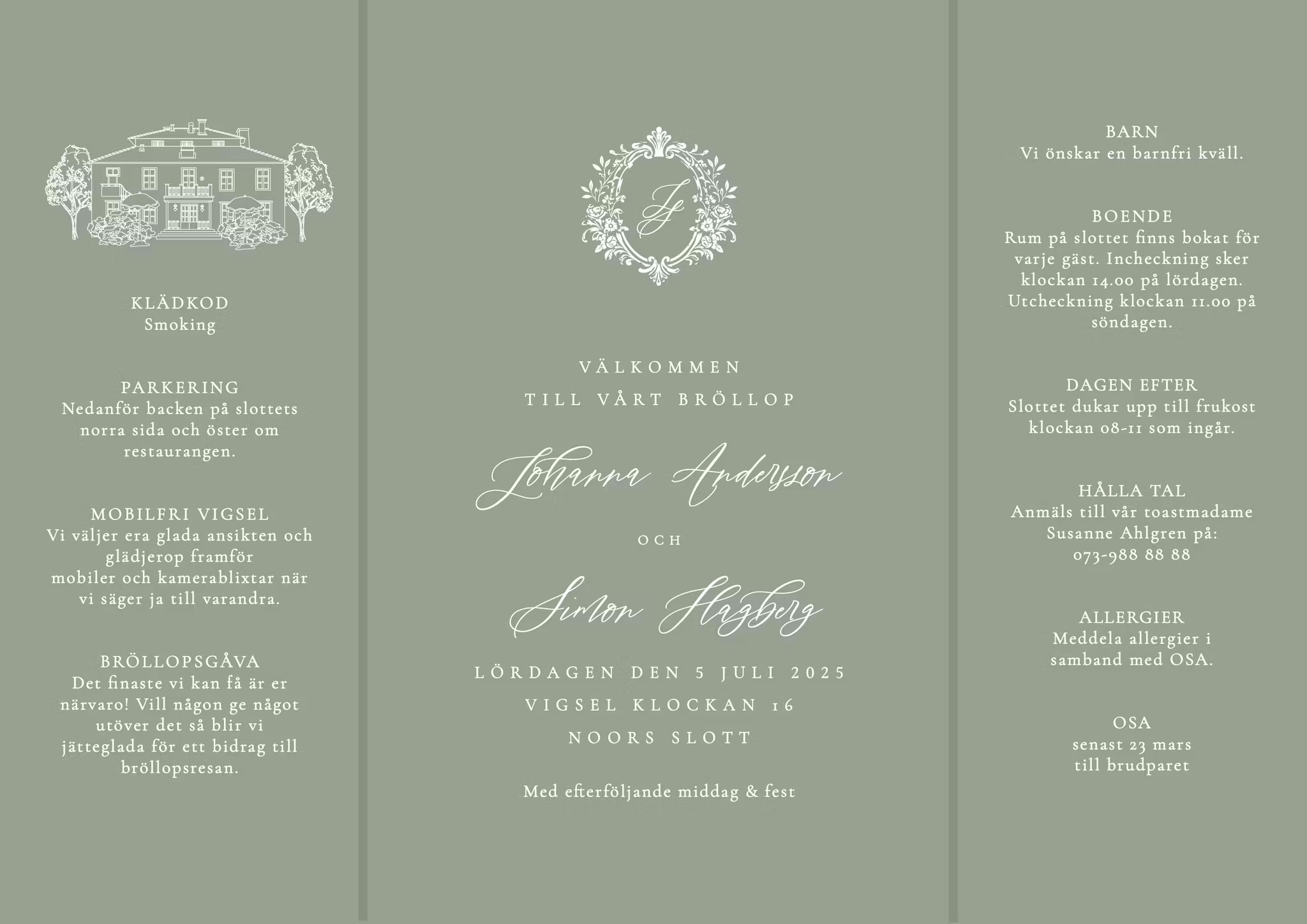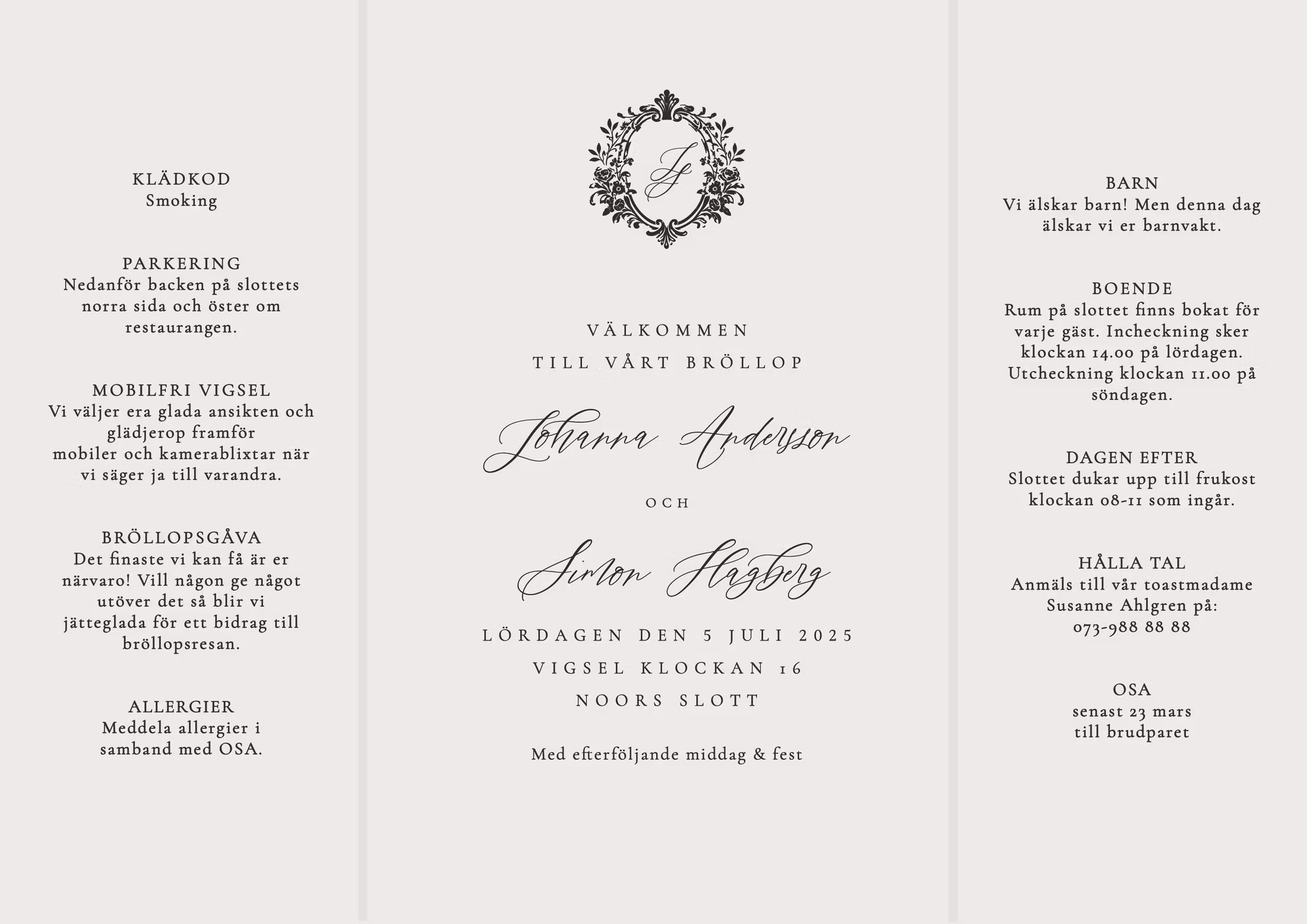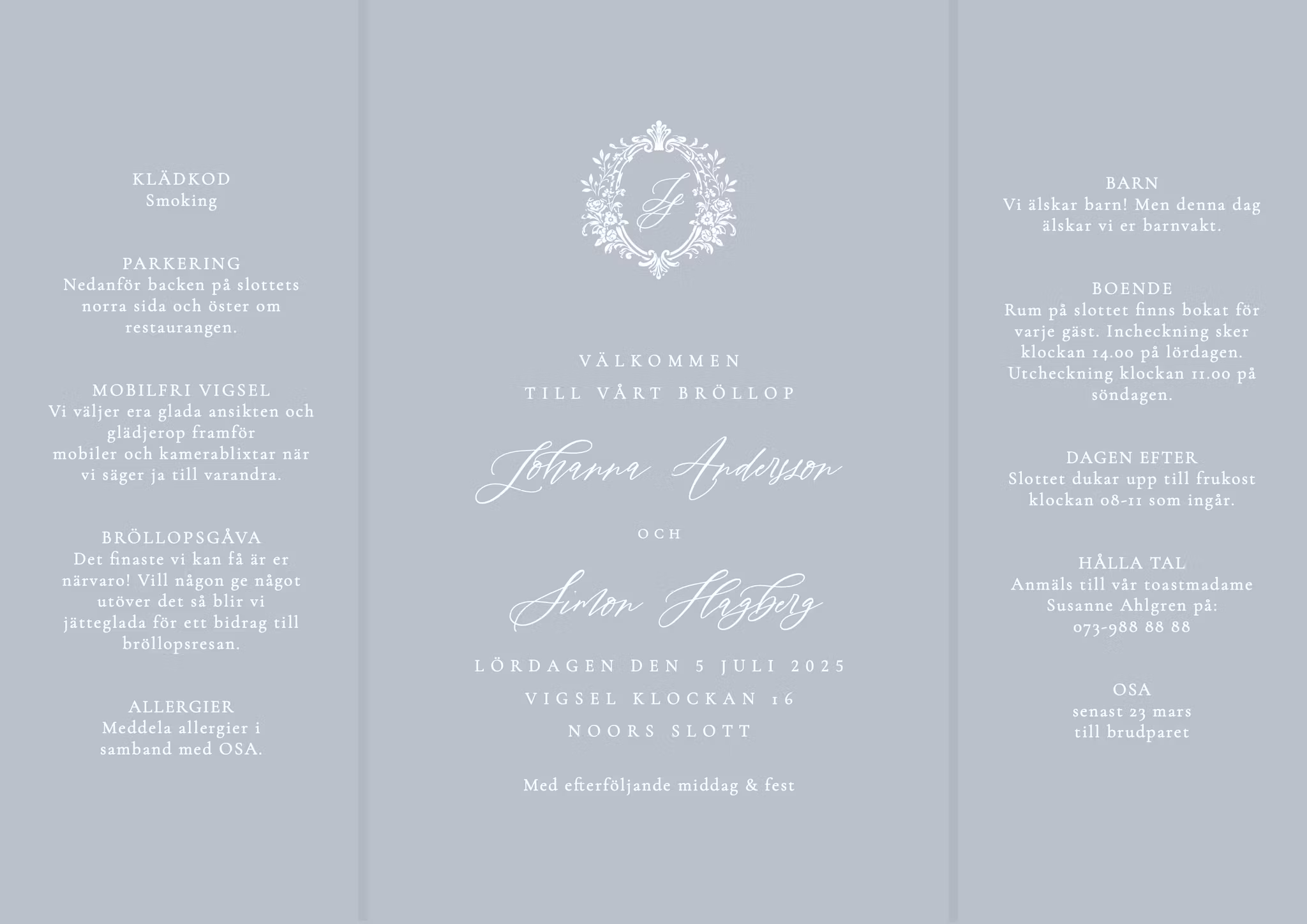 I denna inbjudan, som viks upp, har en minimalistisk design och är till er som vill ha en stilren känsla. I denna inbjudan går det även att kombinera med en personlig tidslinje där personliga illustrationer skapas över er kyrka, festlokal och andra motiv vilket gör er inbjudan helt unik.