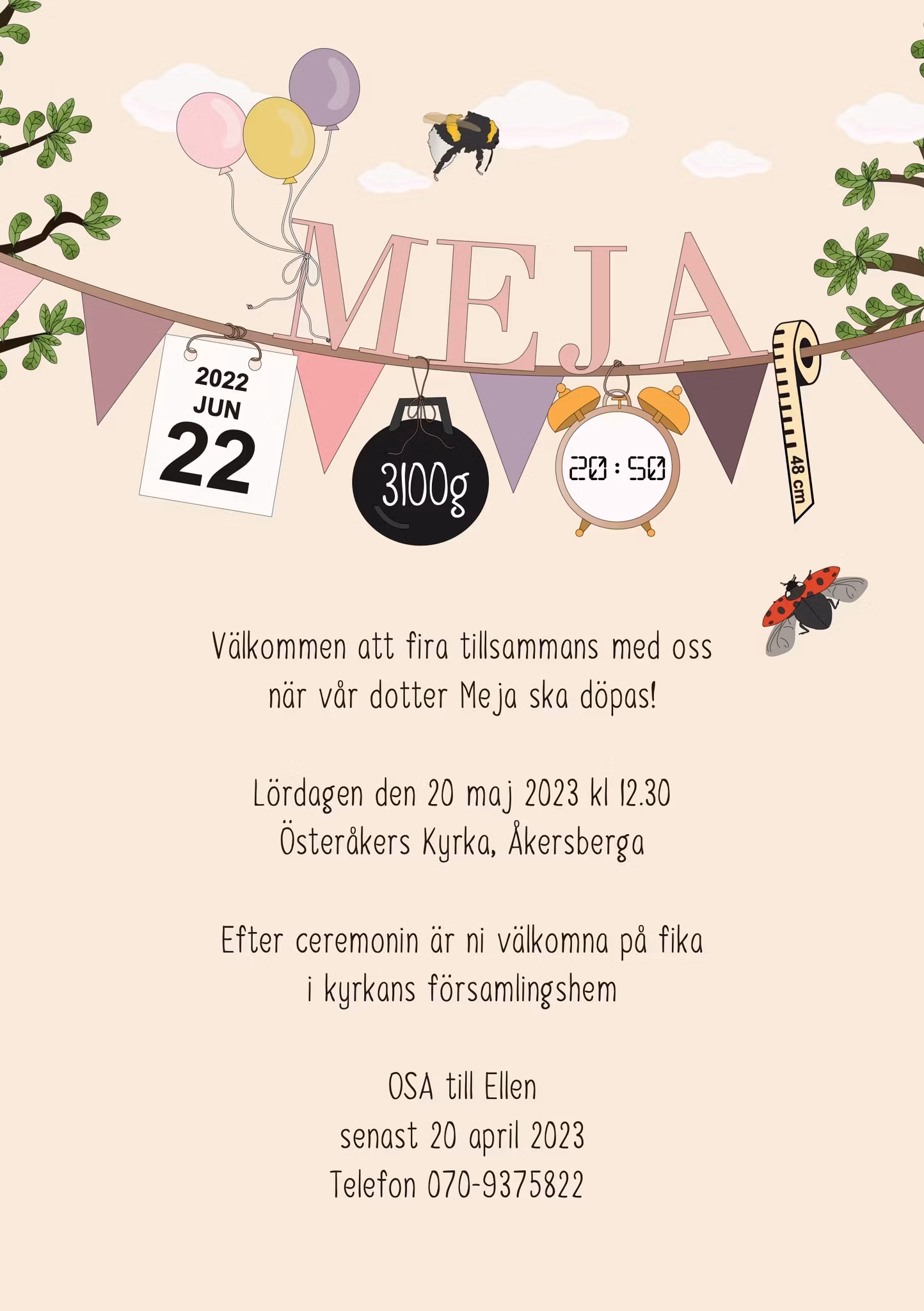 Ett digitalt inbjudningskort till dopet, namngivningen eller kalaset. Kanske är det extra bråttom och du har möjlighet att skriva ut korten själv? Formatet är även perfekt för att skicka på mejl eller SMS som ett digitalt inbjudningskort.